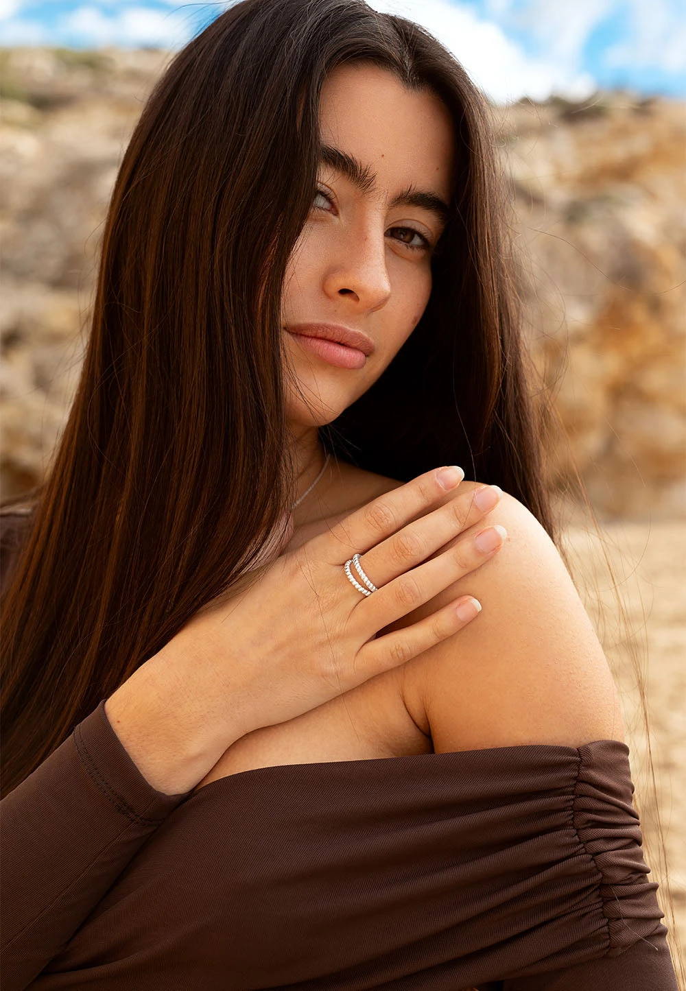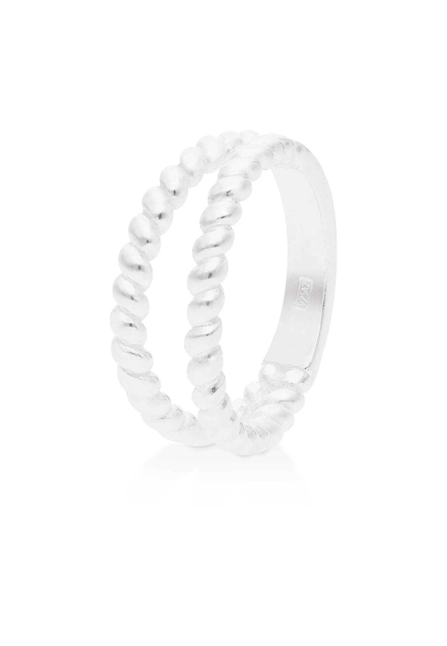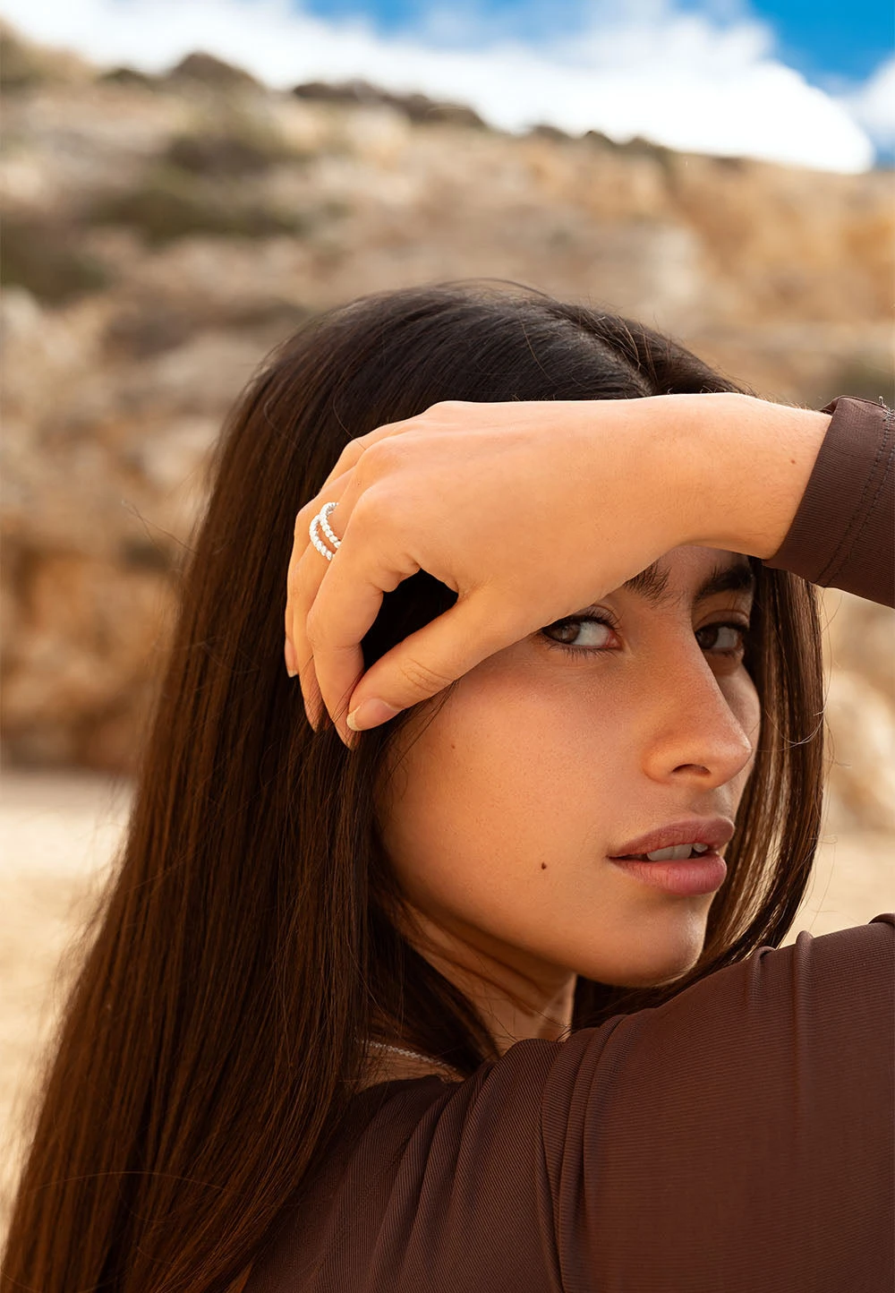 El anillo Abhyasa de plata d eley 925, tiene una serie de bolitas gruesas que rodean todo su contorno, añadiendo un toque de textura y dimensión a tu look. Fabricado con atención al detalle, este anillo doble no solo es elegante, sino también moderno y llamativo. Es la opción perfecta para aquellos que buscan una pieza de joyería que se destaque por su originalidad y sofisticación sin necesidad de adornos excesivos.