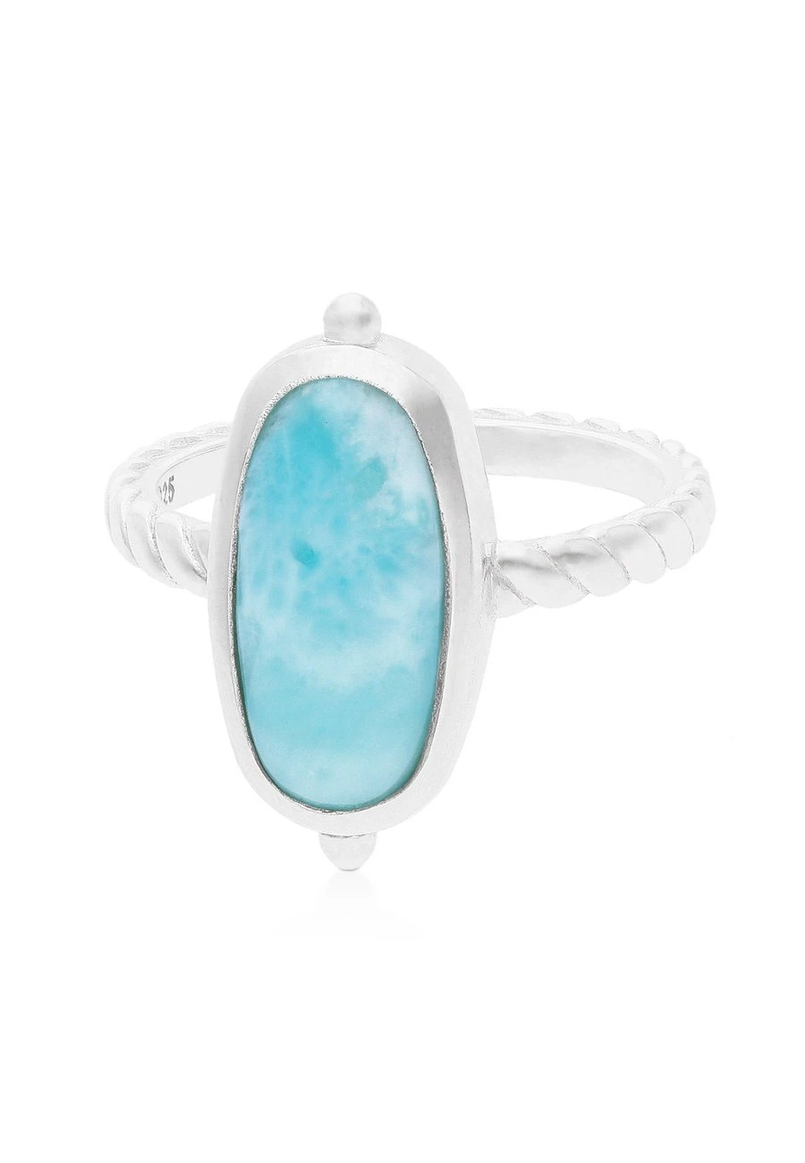 La piedra rectangular de color azul clarito es el verdadero protagonista de este anillo que acompaña a darle este toque llamativo, la piedra Larimar de 7x10cm. Tiene una presencia impactante sin ser abrumadora, permitiendo que la delicadeza de su color y textura brillen por sí mismas.