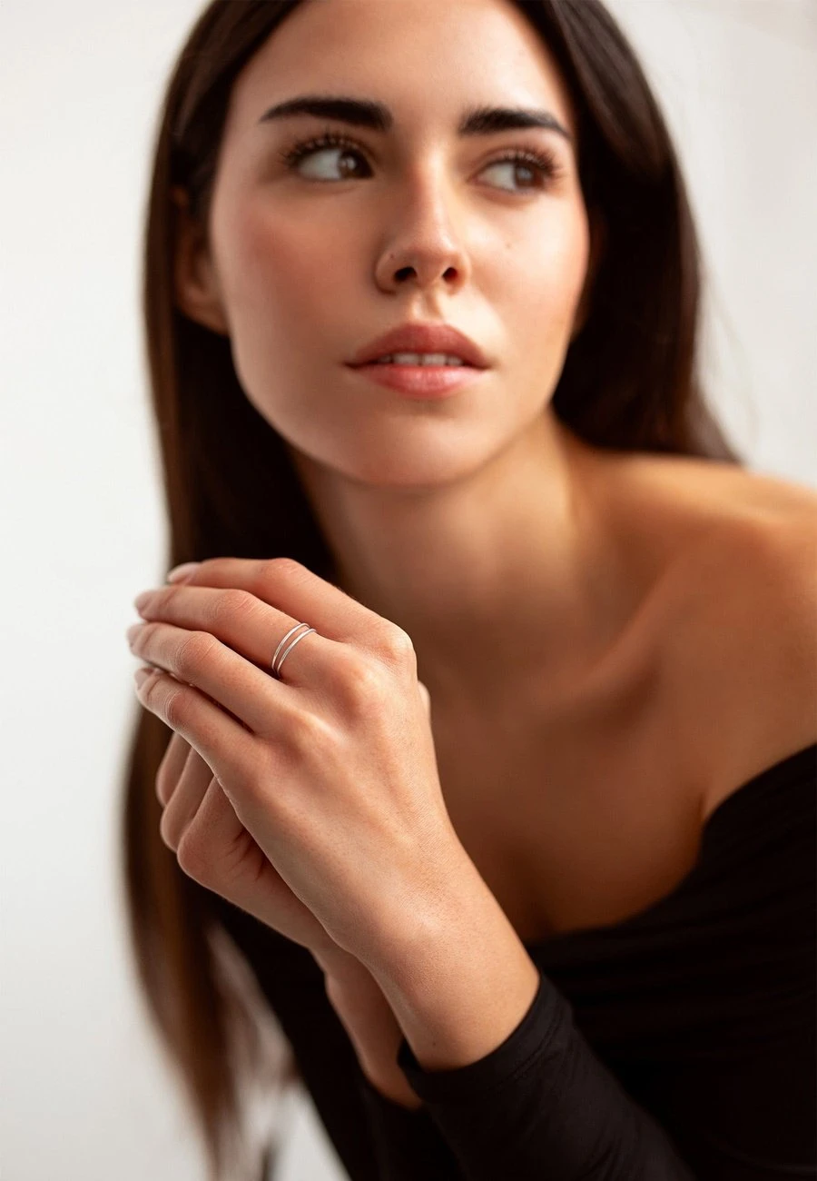 El diseño del anillo BLE es elemental. Consta de dos tiritas de plata paralelas que se unen en la parte trasera del anillo. Es un estilo muy finito y delicado.
