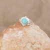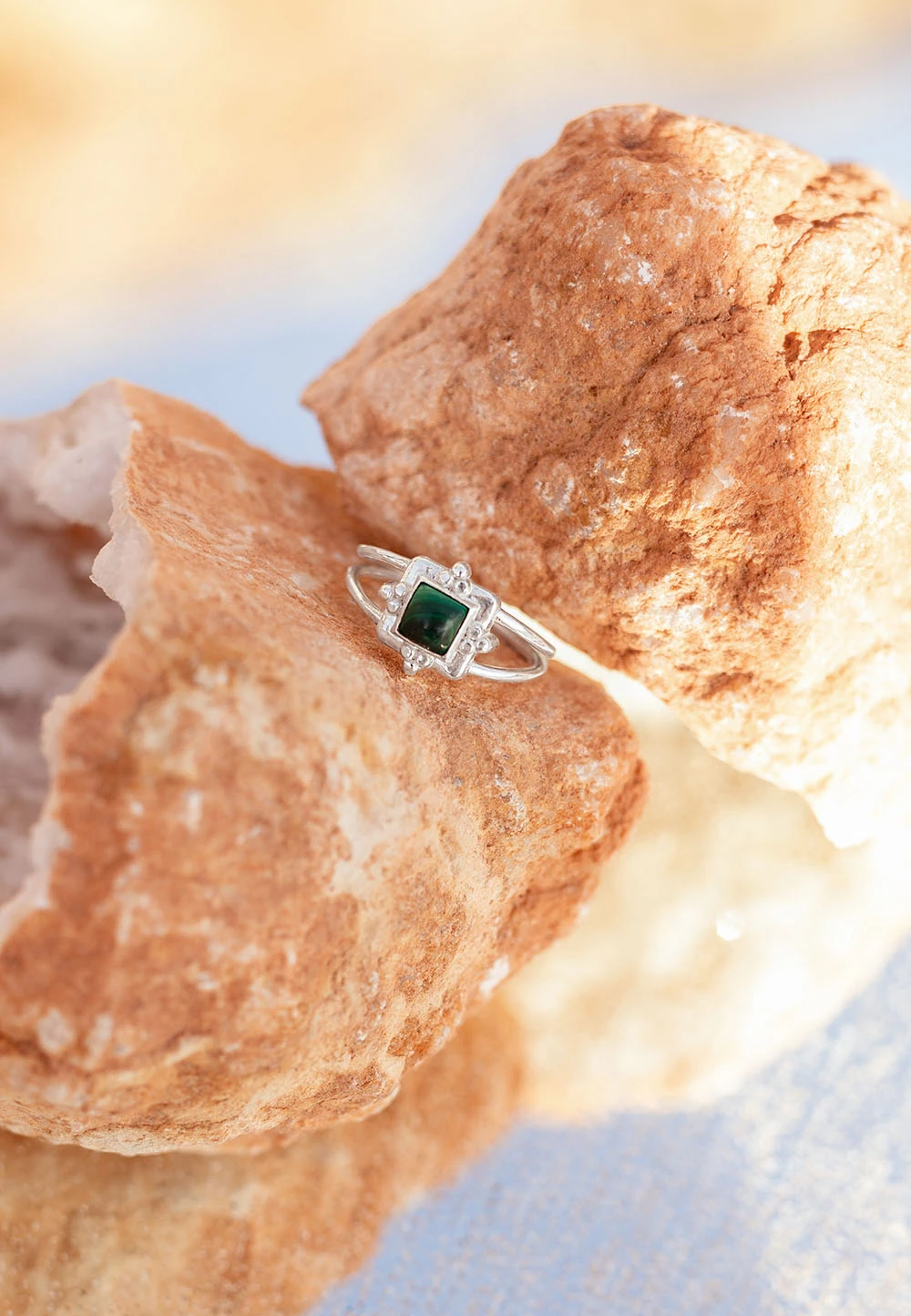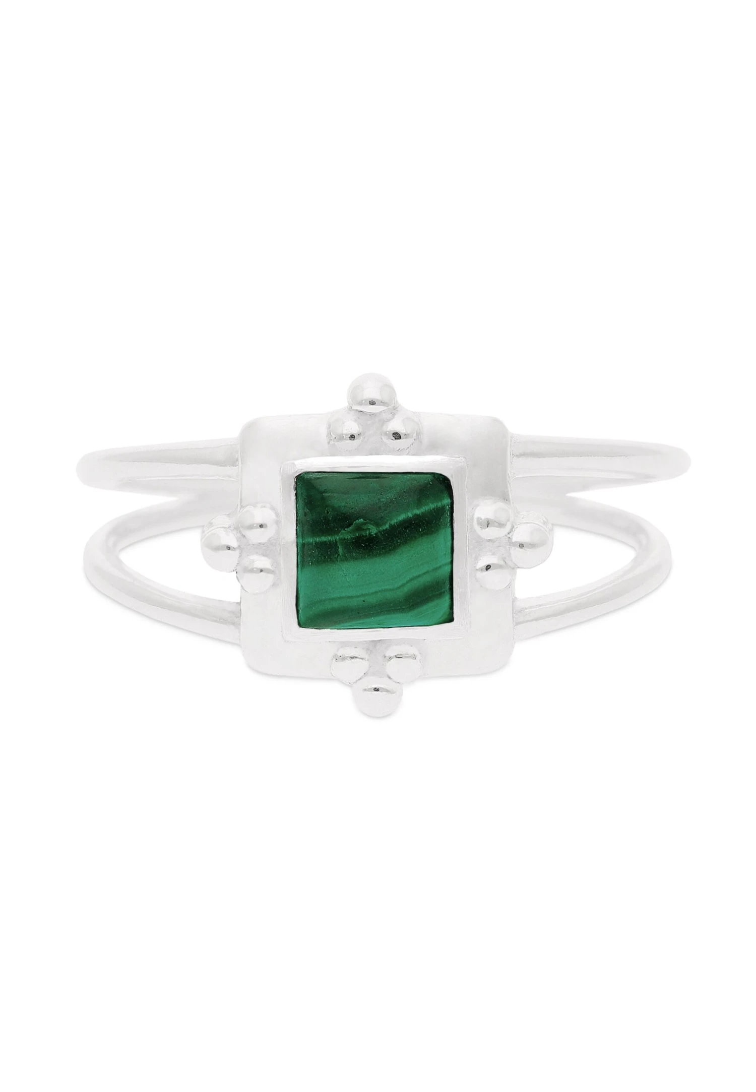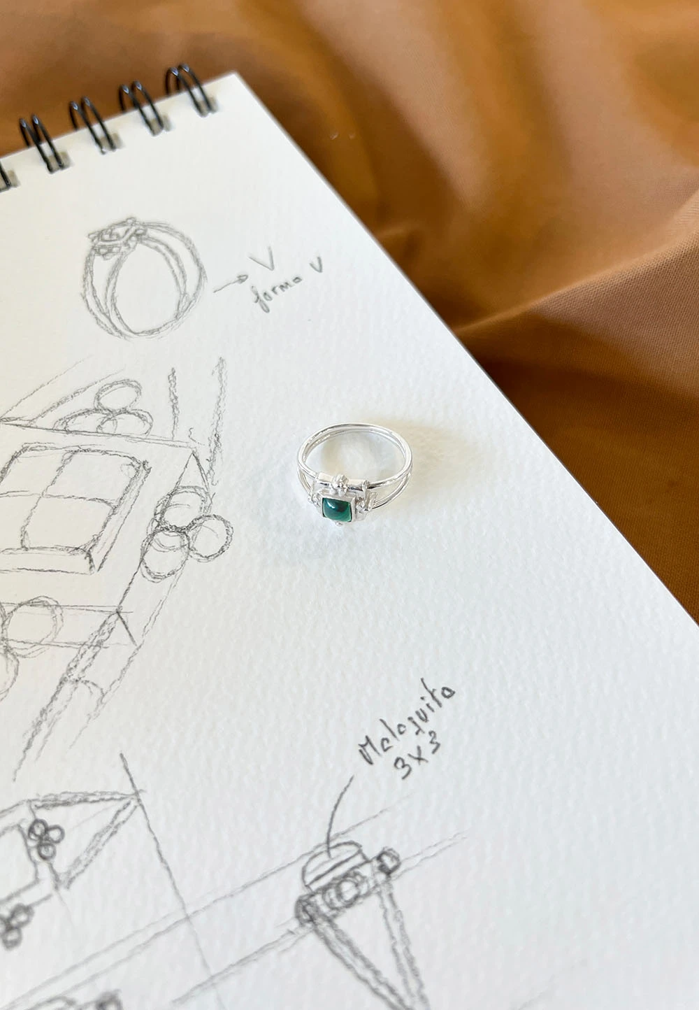 Alrededor de la piedra de malaquita, en cada lateral, se encuentran tres pequeños puntitos dispuestos en forma de cuadrado, añadiendo un toque de detalle y originalidad al diseño. Estos detalles sutiles resaltan la belleza natural de la piedra central y complementan la elegancia del anillo.