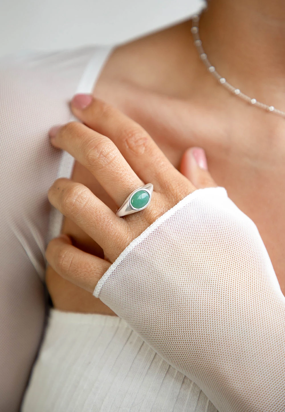 El anillo Ketan de plata de ley 925, tiene en el centro una hermosa piedra aventurina, cuidadosamente engarzada en forma ovalada. La aventurina, con sus tonos verdes naturales, transmite una sensación de calma y equilibrio, perfecta para llevar en tu día a día.