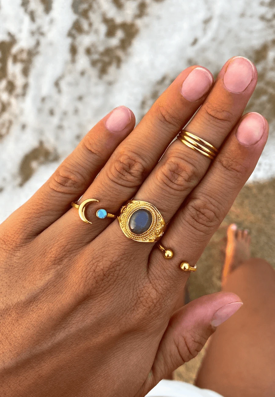 El anillo KEVAL CHAPADO EN ORO es una pieza muy exclusiva. Su diseño es ancho con una llamativa piedra natural Labradorita ovalada. La piedra está rodeada por pequeños detalles de estilo Boho.