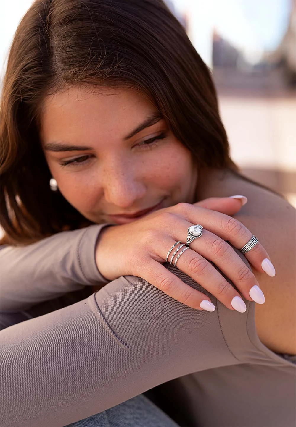 El anillo KIRA tiene un estilo impecable y súper atractivo. Esta joyita de Plata de Ley 925 uno de vuestros anillos favoritos. Tiene un diseño de triple tira finita con el detalle de unas pequeñas rayitas en vertical que crean un relieve un poquito más profundo con tonos más oscuritos.