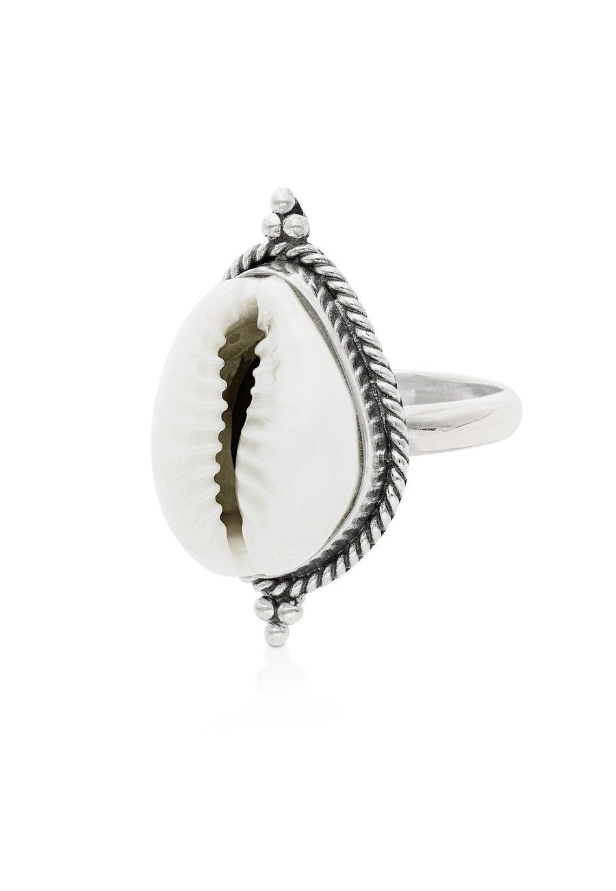 El diseño del SAGARA se centra en destacar la concha natural, rodeada por una fina línea de plata entrelazada y tres bolitas pequeñas en la parte superior e inferior del anillo.