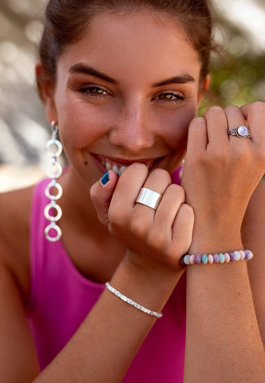 El anillo SAMA es de Plata de Ley 925 y tiene un tamaño mediano-grande. Es muy sencillo eso hace que sea perfecto para combinar con anillos más finitos o con alguno más llamativo.