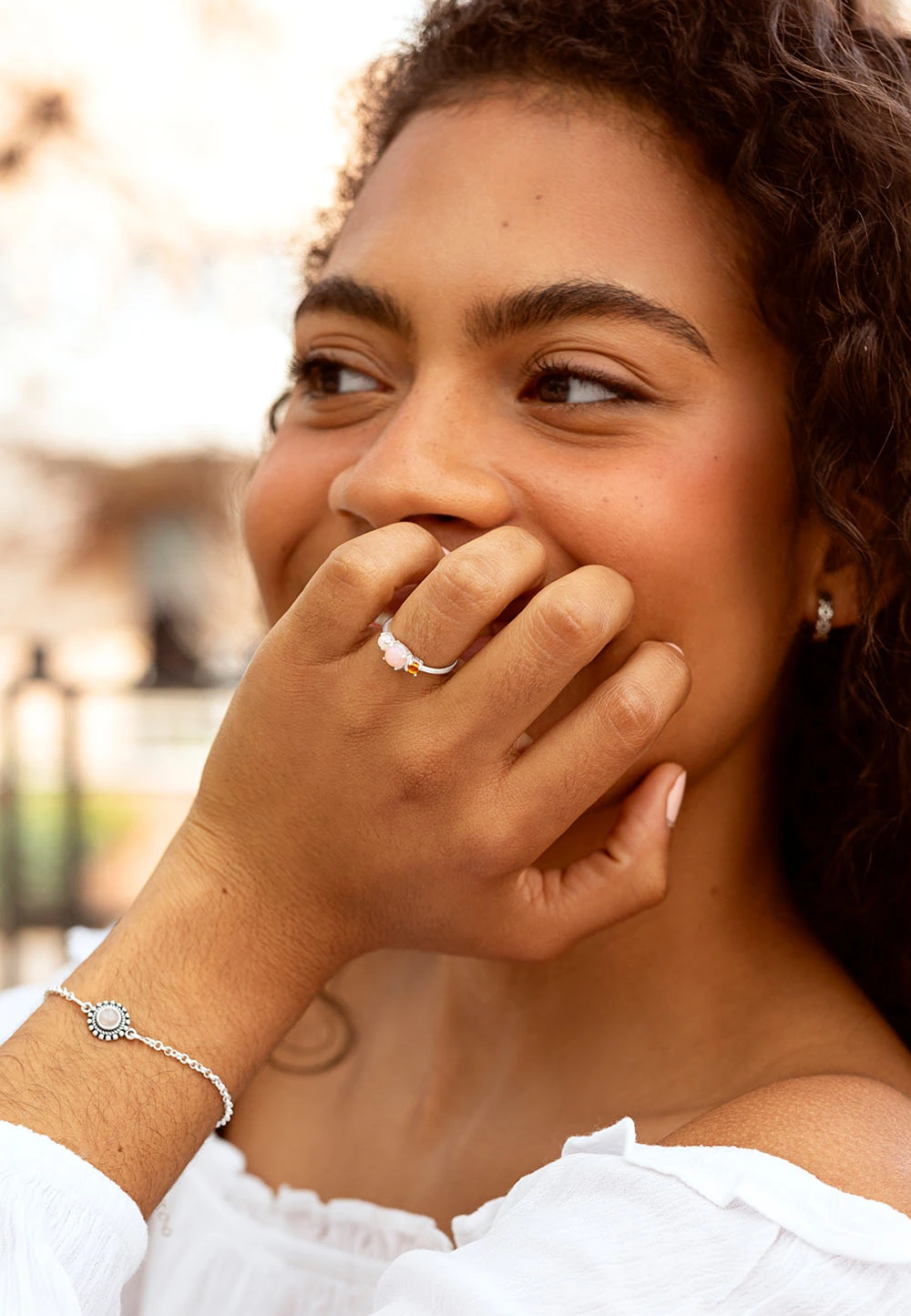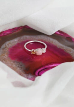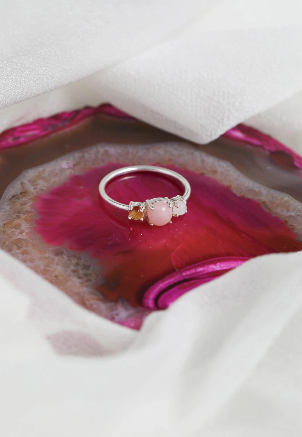 A su lado, un ópalo rosa cabujón redondo, delicadamente adornado, añade un toque de dulzura y ternura a este anillo. Su suave tonalidad rosa evoca la belleza y la suavidad de los momentos más preciosos de la vida, recordándote la importancia de amarte a ti misma.