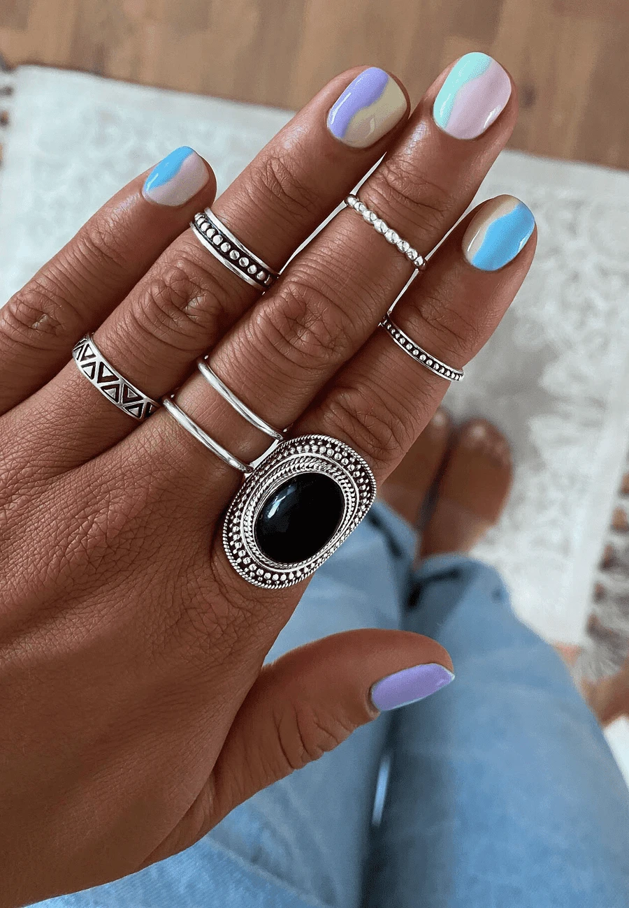 El anillo TILA es un anillo superllamativo y bonito con Piedra Ónix, una piedra natural con un intenso y precioso color negro.