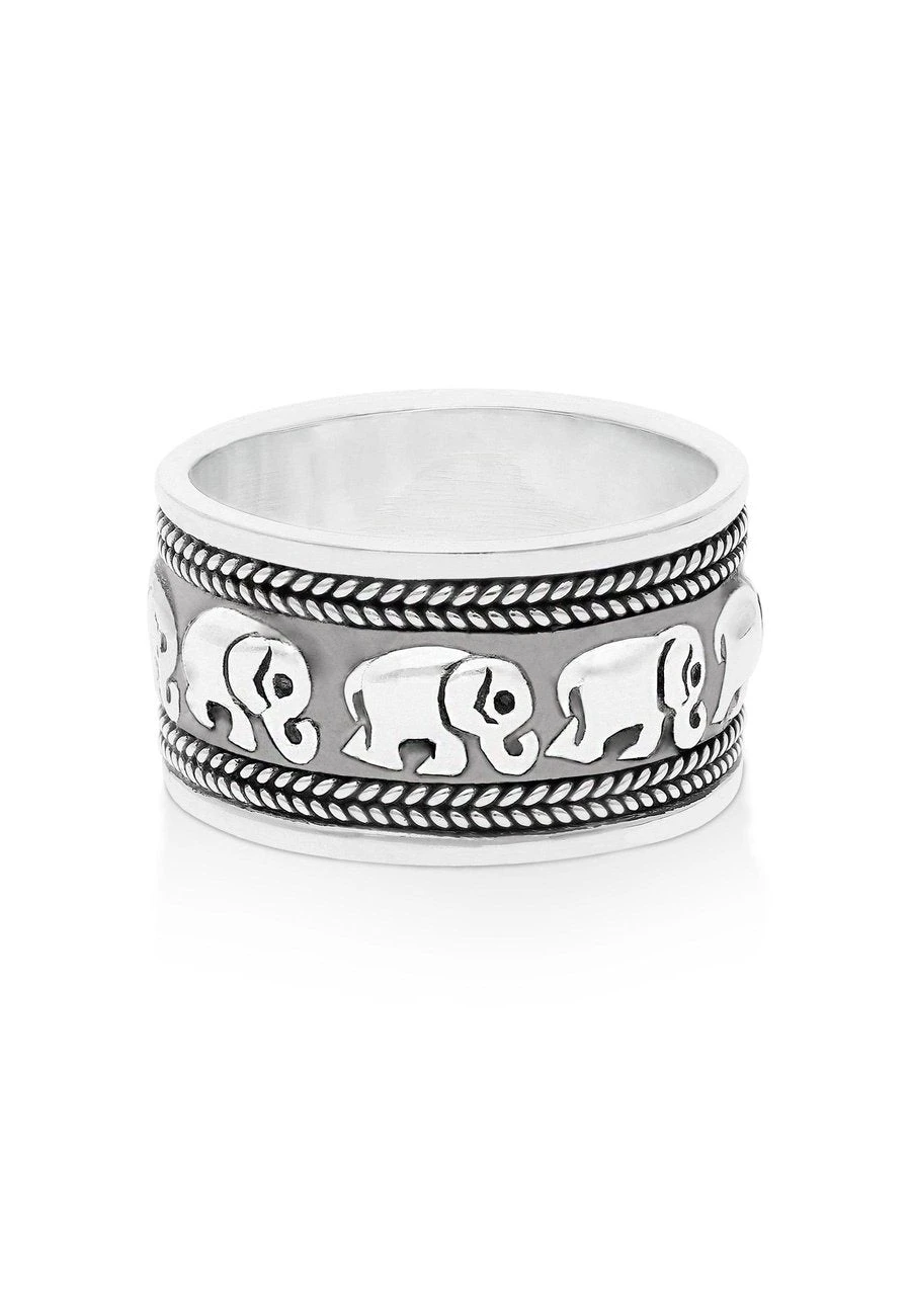 El anillo VASA es un anillo tematizado con varios elefantes que rodean toda la pieza de forma horizontal. El anillo tiene un tamaño mediano-grande y está hecho en Plata de Ley 925.