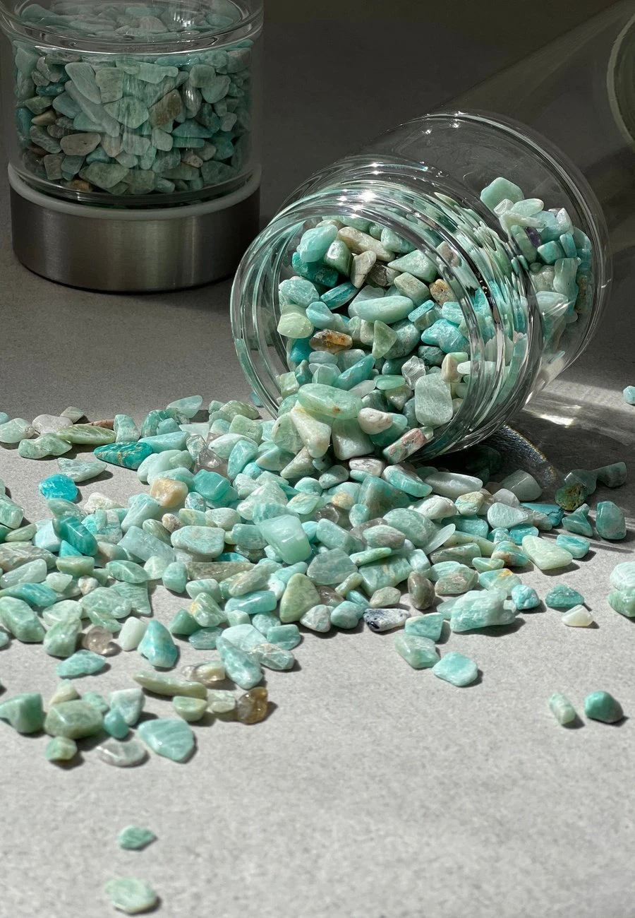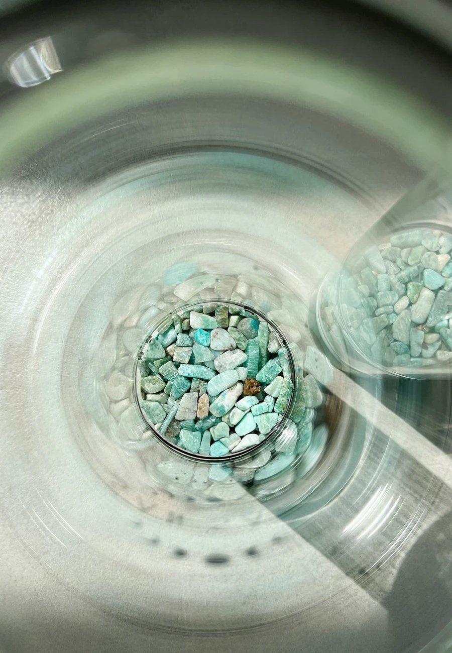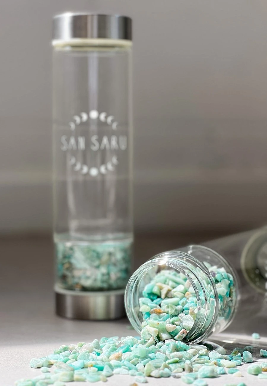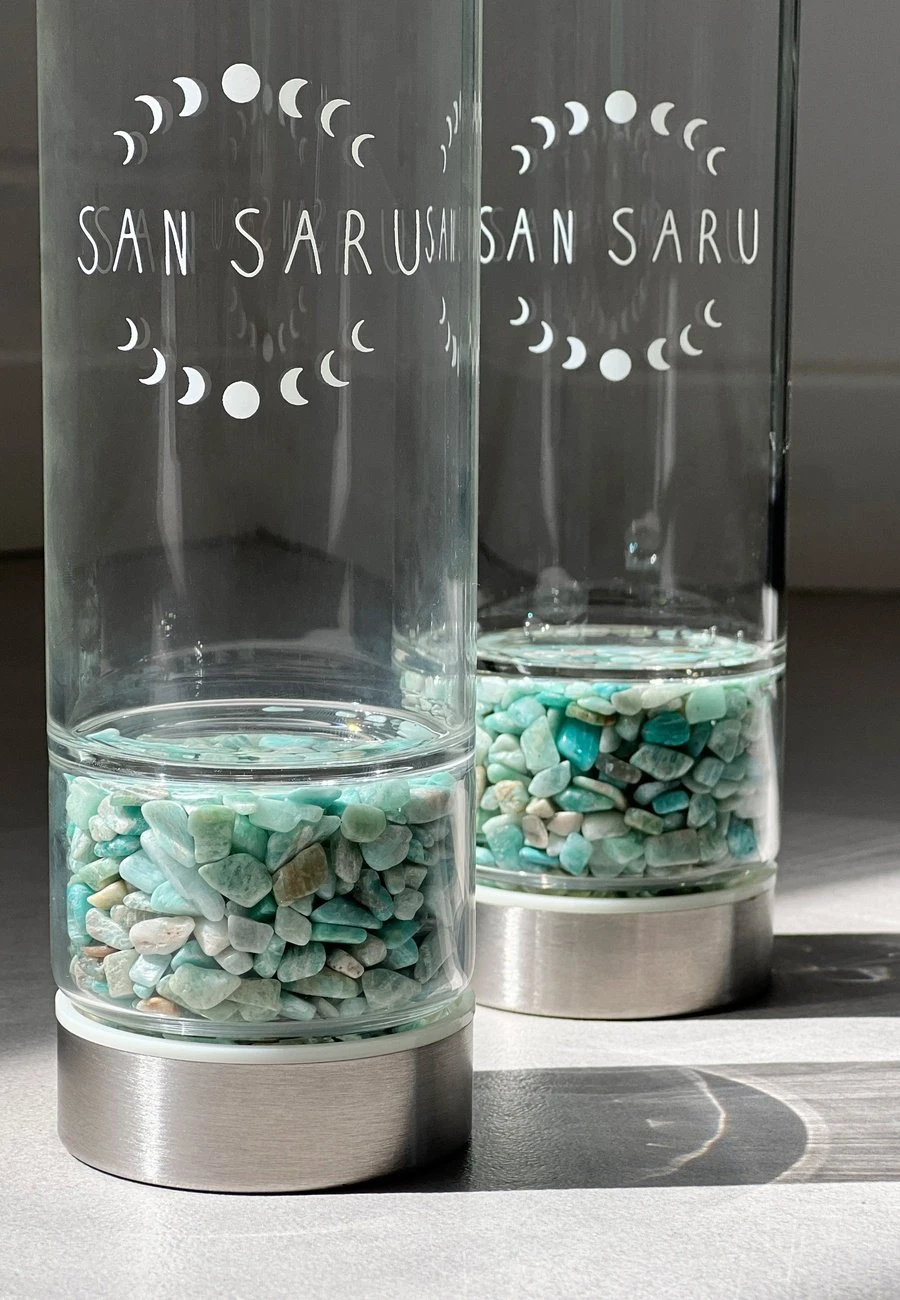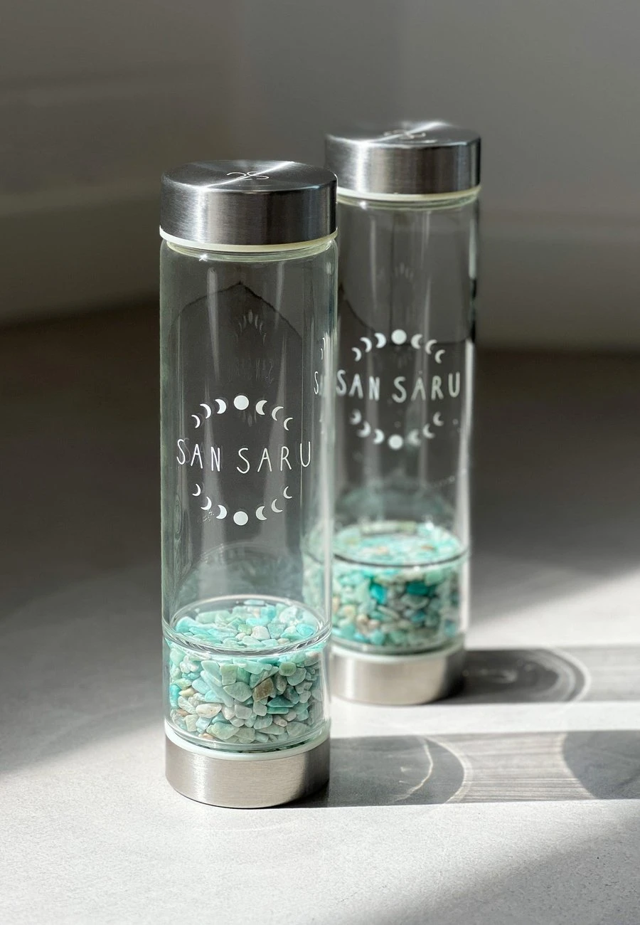 La botella JAL es de vidrio resistente, perfecta para dejar en la ofi, en tu centro de entreno o en casa cerca de la cama. Está diseñada con una base de piedras Amazonita naturales. Se cree que las piedras, al estar cerca del agua, aportan sus propiedades.