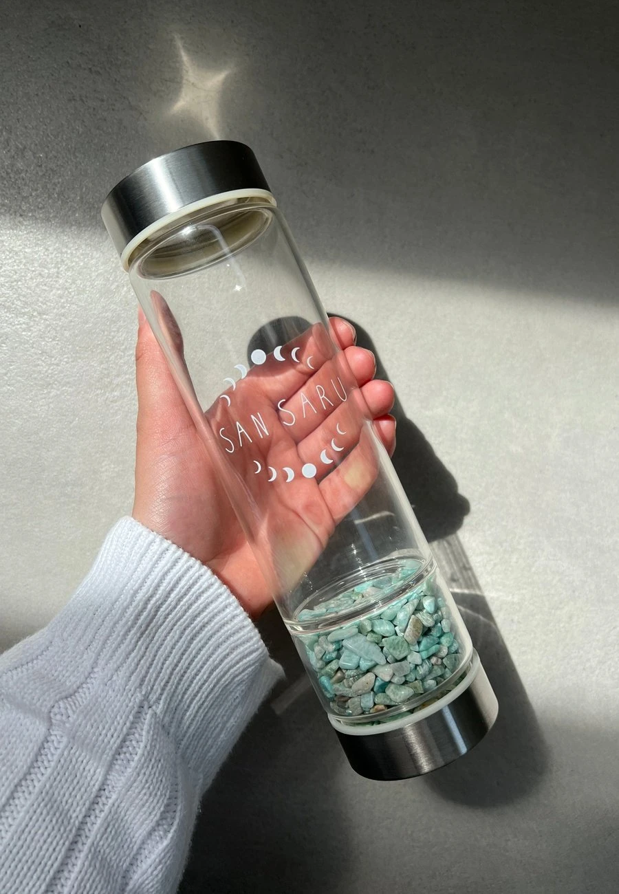 La JAL no solo destaca por el color verdoso de las piedras Amazonita, también tiene un bonito diseño en el centro con las fases lunares, que añaden un toque mágico a la botella.