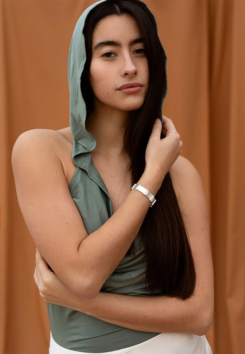El brazalete Bhuta chapado en plata de ley 925, tiene una caracterítisca muy peculiar, unas las líneas verticales que cruzan alrededor de toda su circunferencia, añadiendo un toque de dinamismo y elegancia a su diseño. Estas líneas evocan la fortaleza y la libertad que representa la diosa Hathor, recordando la verticalidad de los árboles y la vitalidad de la naturaleza.