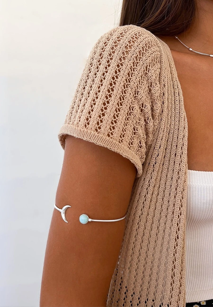 El brazalete CHANDANE tiene piedra larimar en uno de los extremos y una media luna en el otro. Si te gusta su diseño puedes combinarlo con el anillo LINA y el collar SUJAN. ¡Crearás una combi preciosa!