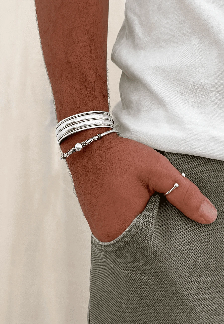 El brazalete YISHAI es un brazalete de Plata de Ley 925 con un relieve muy original, combinando partes lisas con un pequeño volumen y tres entrelazados muy finitos. Esta pieza tan bonita está hecha a mano y hemos cuidado cada detalle desde su diseño hasta su creación.