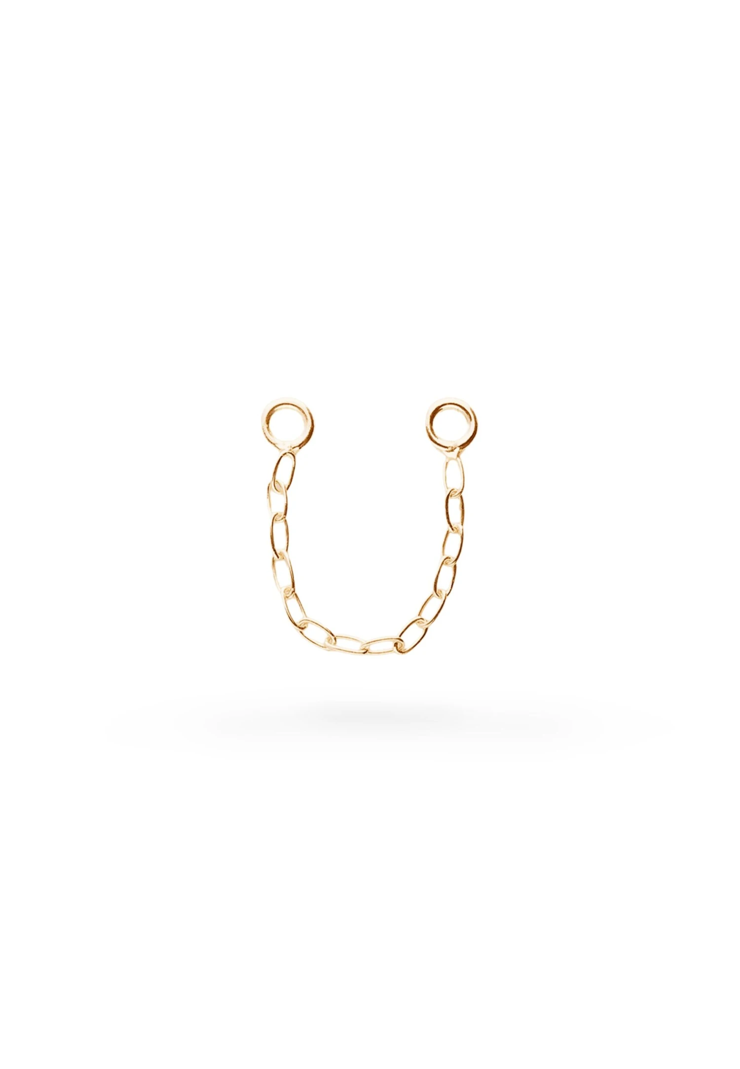 Esta cadena de plata de ley 925 y chapada en oro es una pieza elegante y funcional diseñada para complementar tus pendientes o piercings. Está compuesta por dos argollas en los extremos, lo que permite engancharla fácilmente en la parte trasera de tus pendientes.