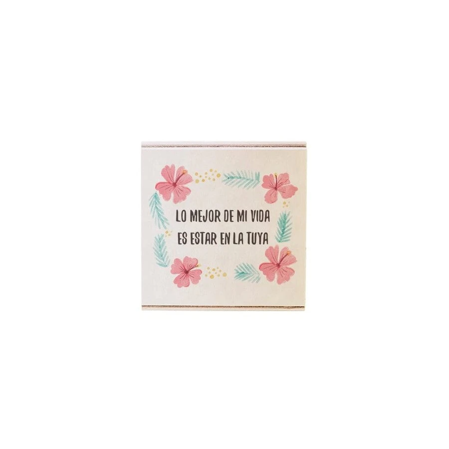 Esta cajita tiene un diseño exclusivo en el que se destaca la frase “lo mejor de mi vida es estar en la tuya” con hojas y flores tropicales dibujadas alrededor. ¡Perfecta para enamorar!