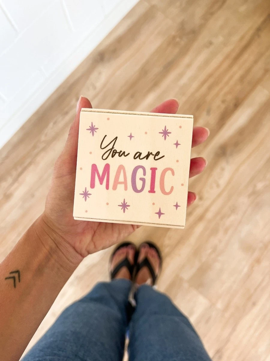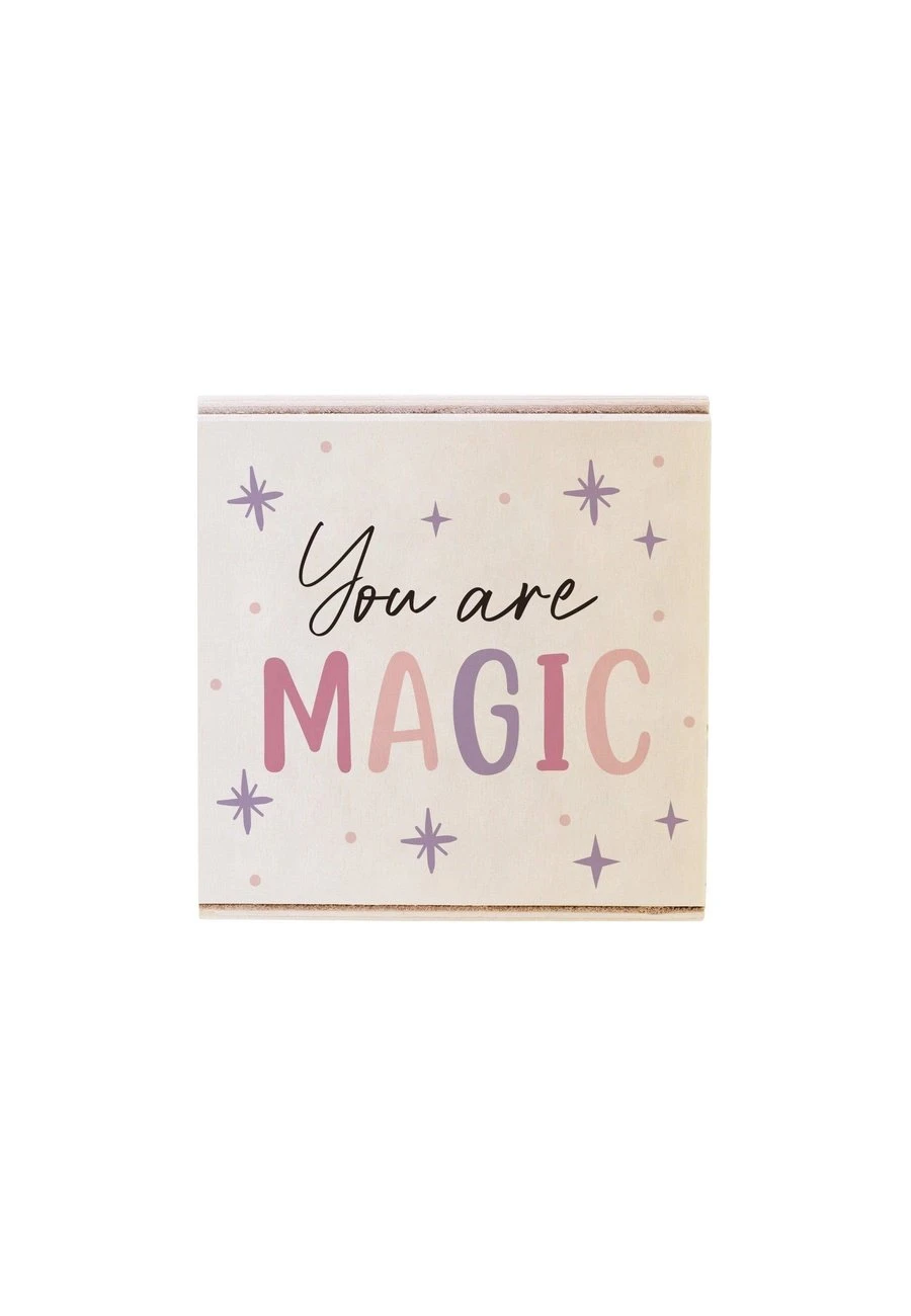 El diseño de la caja MAIJIKAL tiene una frase en inglés “you are magic” rodeada de estrellitas de color lila. ¡Es una cajita muy empoderadora!
