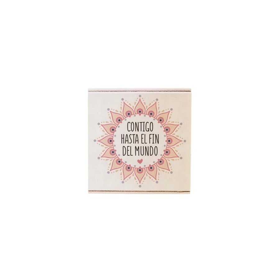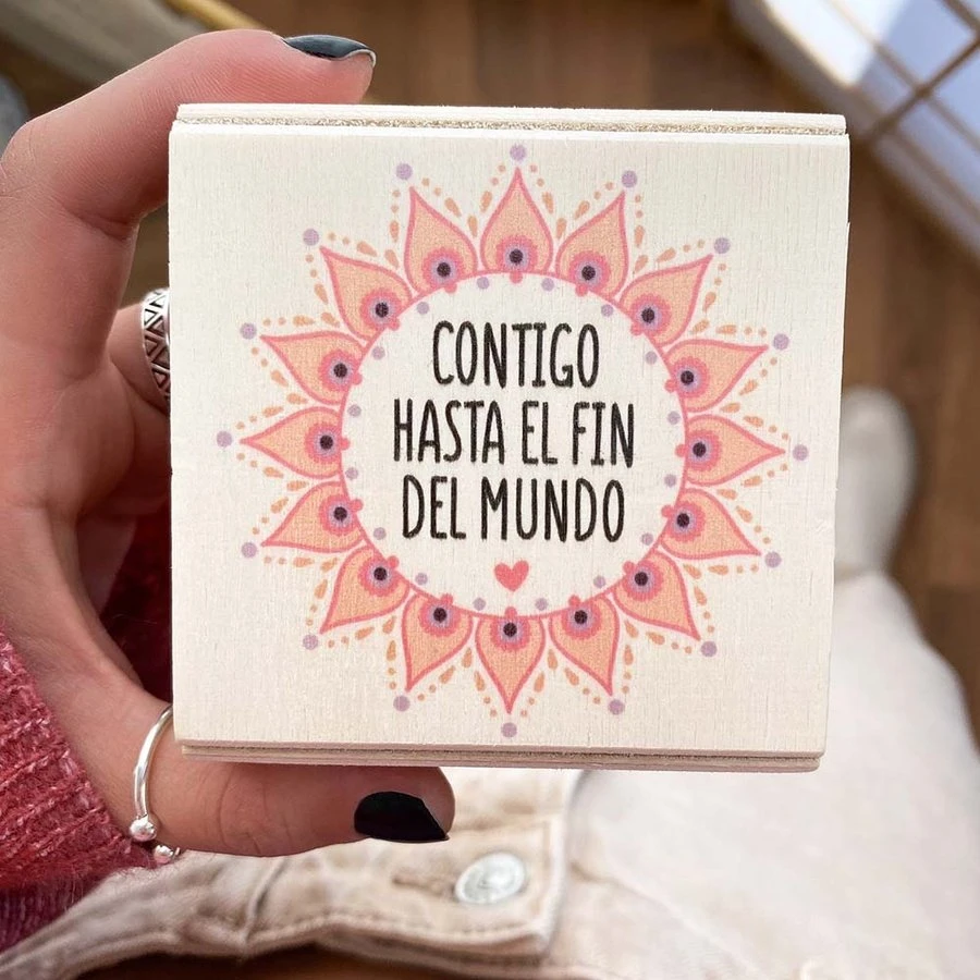 Caja SARASWATI tiene un diseño y mensaje muy especial. La frase “contigo hasta el fin del mundo” está rodeada por una mandala de colores pastel.