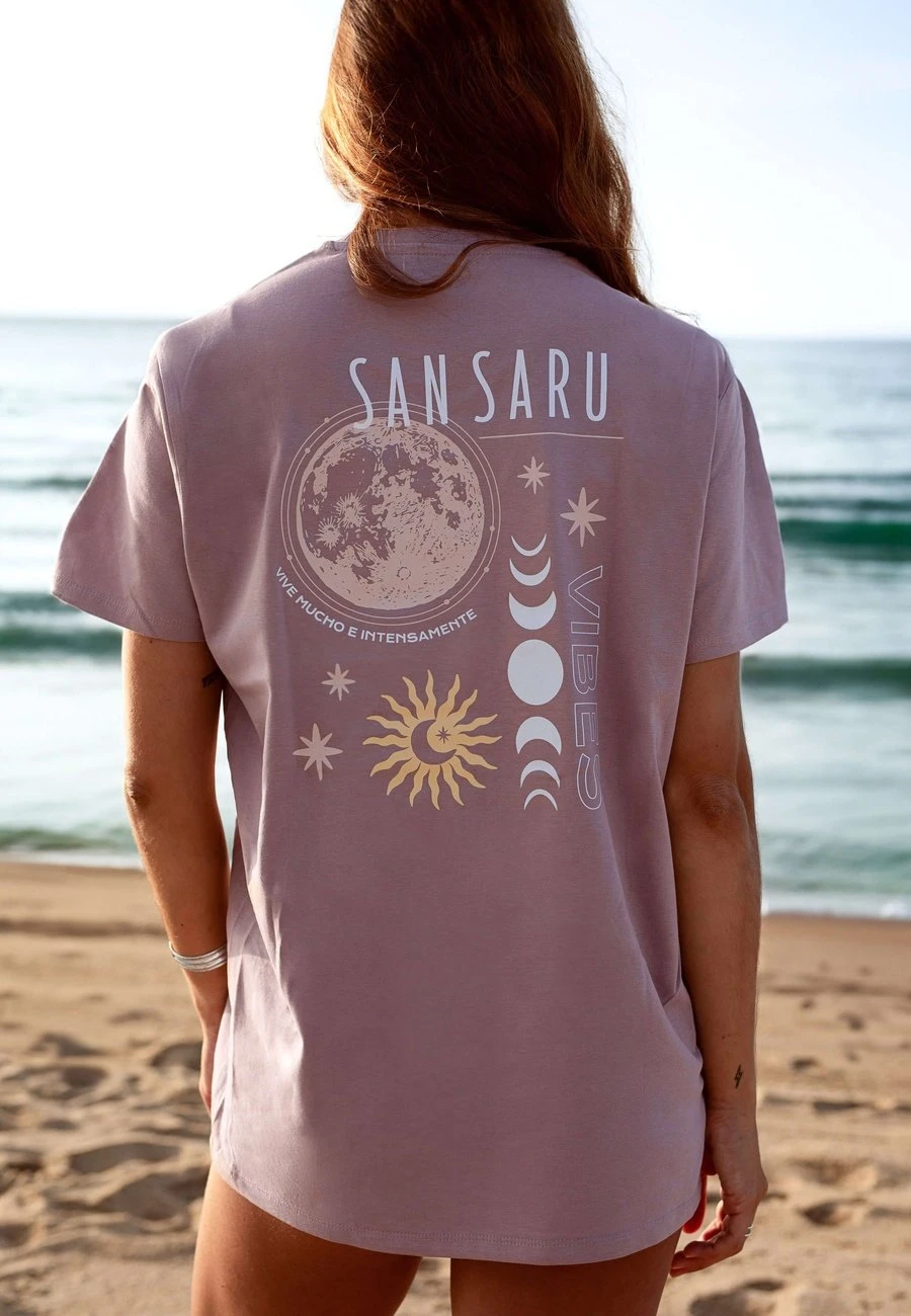 La camiseta Bhasah de color lila pastel, está hecha de algodón con un diseño celestial de la luna y el sol. Esta prenda está diseñada para agregar un toque de encanto y magia a tu guardarropa. Con el nombre de nuestra marca, “San Saru” en la parte trasera.