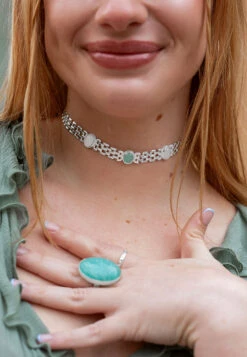 En el corazón del choker HAI chapado en plata de ley 925, reposan tres preciosas piedras de cristal, cada una única en su tono y textura. Las brillantes tonalidades de blanco y verde se entrelazan armoniosamente, evocando la frescura de la naturaleza y la pureza de la luz. Estas piedras, con su destello sutil pero cautivador, añaden un toque de elegancia y sofisticación a cualquier atuendo.