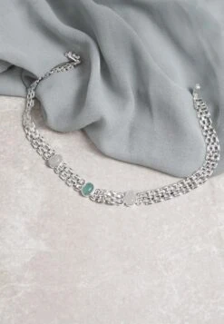 En el corazón del choker HAI chapado en plata de ley 925, reposan tres preciosas piedras de cristal, cada una única en su tono y textura. Las brillantes tonalidades de blanco y verde se entrelazan armoniosamente, evocando la frescura de la naturaleza y la pureza de la luz. Estas piedras, con su destello sutil pero cautivador, añaden un toque de elegancia y sofisticación a cualquier atuendo.