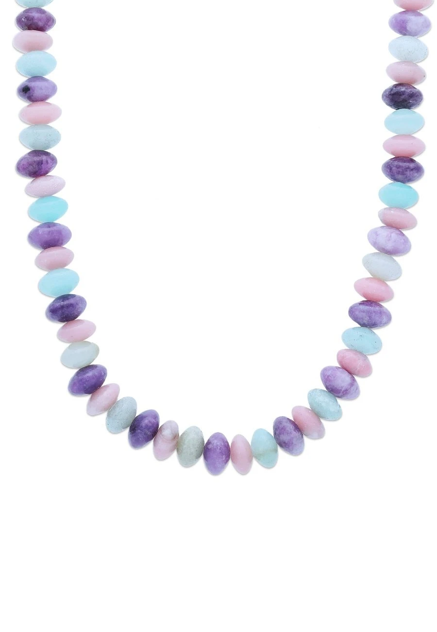 El ANANTA es un collar superveraniego. Está formado por piedras redondas de ópalo rosa, amazonita, lepidolita y crisoprasa, una al lado de la otra y con tonalidades distintas. El cierre del collar es de Plata de Ley 925.