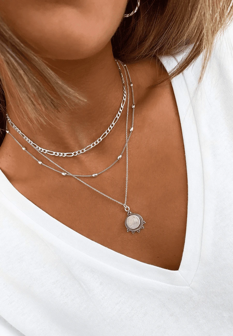El collar APARNA es una joyita única, atemporal, y con un tono brillante natural. Destaca por tener una preciosa Piedra Luna rodeada por una mandala.
