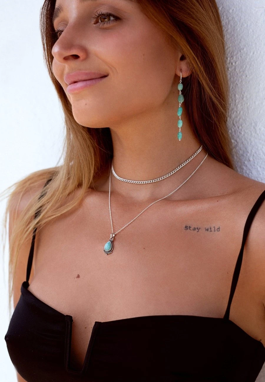 El collar BINDU es un collar superelegante y original, hecho con Piedra Amazonita y Plata de Ley 925. Esta joyita tiene una precioso e intenso color esmeralda.