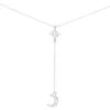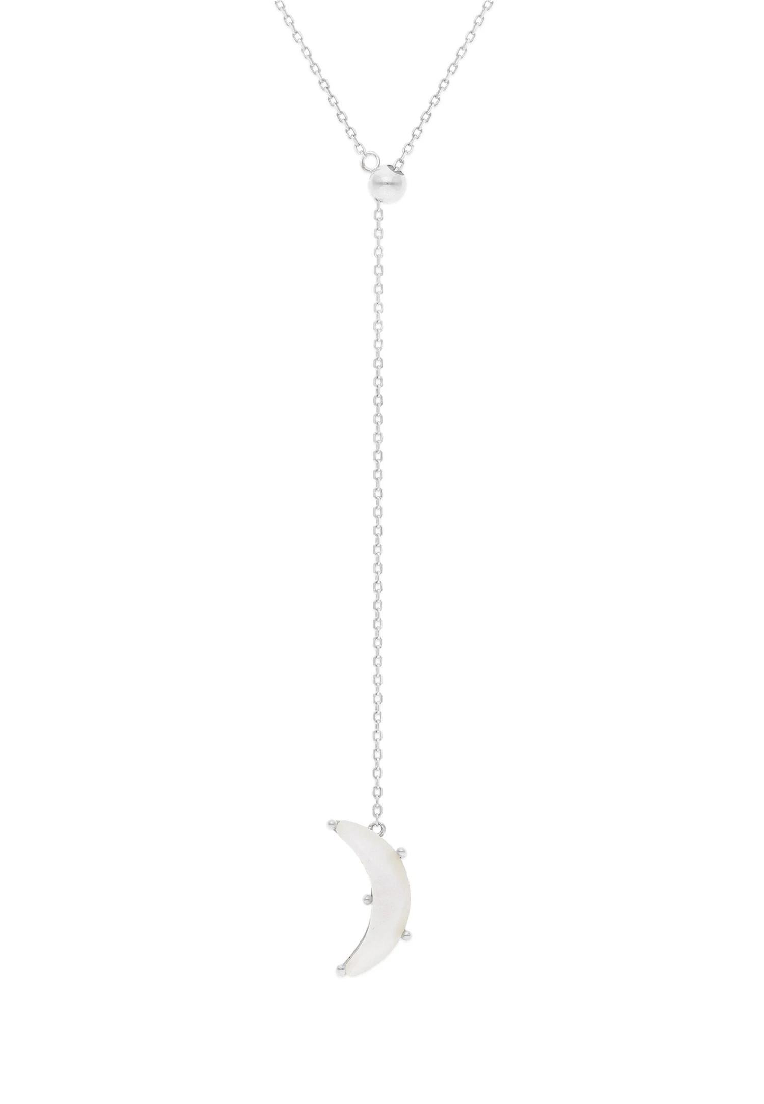 La delicada cadena sujeta el colgante de una luna, que lleva incrustado la piedra Nácar. Se dice que la piedra nácar tiene propiedades intuitivas y protectoras, lo cual hace que este collar sea aún más especial.