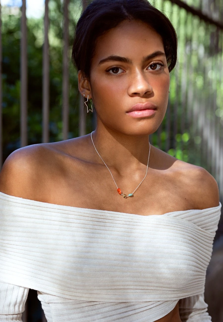 La amazonita aporta serenidad, el citrino brilla con calidez y la cornalina agrega vitalidad. Puedes combinarlo perfectamente con los pendientes Dipti para crear una combinación de estilo única. ¡Resalta tu belleza y añade un toque de color a tu look de otoño con este collar excepcional!