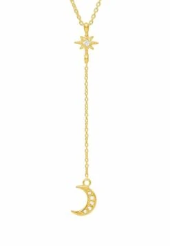 El MOKSHA CHAPADO EN ORO está compuesto por una estrella y una luna con circonitas incrustadas. De la estrella cuelga una fina cadena con la lunita en la punta. ¡Es un collar con mucho brillo!