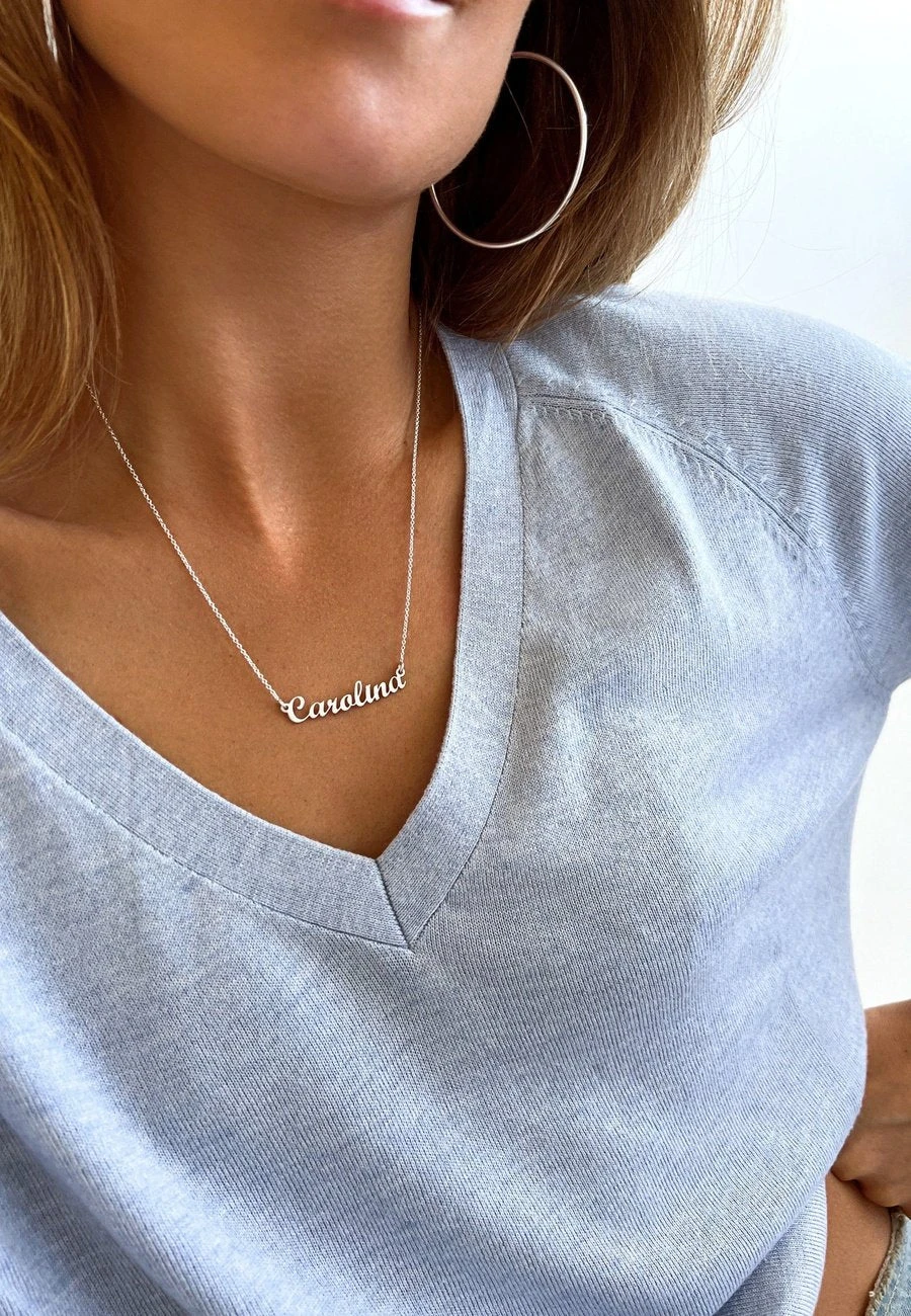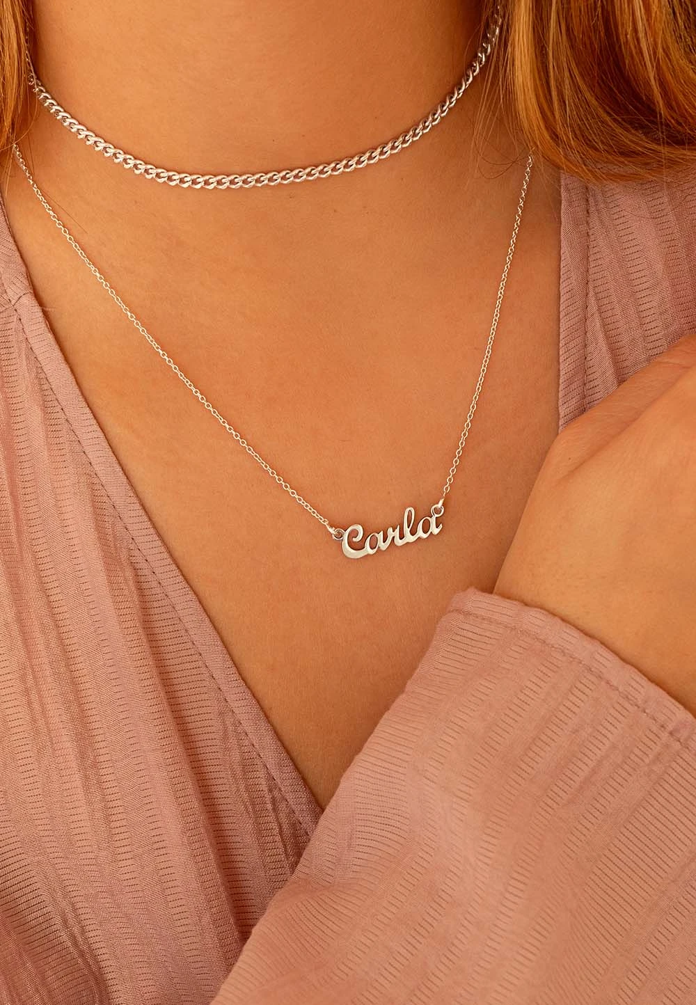 El collar NAMA está hecho de Plata de Ley 925. Es un collar formado por una fina cadena de eslabones con un nombre a personalizar. Tendrás que escribir la palabra que quieras con un máximo de 9 caracteres en el apartado “texto”.