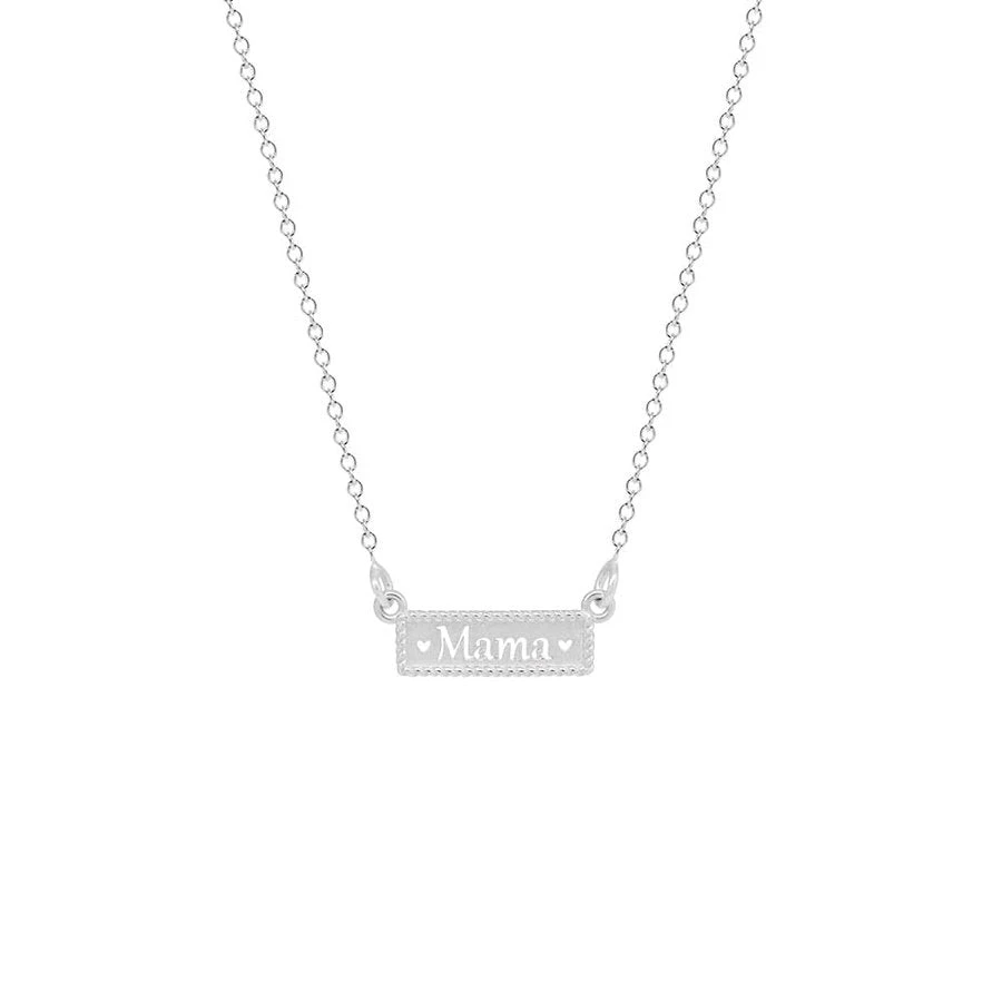 El collar RAN está compuesto por una fina cadena y una chapa rectangular horizontal con la palabra “mama” calada en ella. La chapa está rodeada por un bonito trenzado, y la palabra “mama” tiene dos pequeños corazones a cada lado.