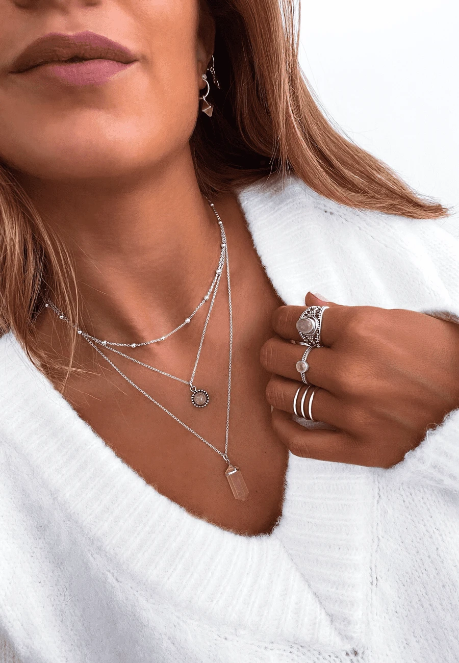 Si te gusta mucho esta línea, tenemos dos collares que seguro te enamorarán: el TALAK y el SHARAN. Ambos con un diseño similar pero con Piedra Turquesa. Déjate enamorar por las piedras naturales y el collar SAVATI.