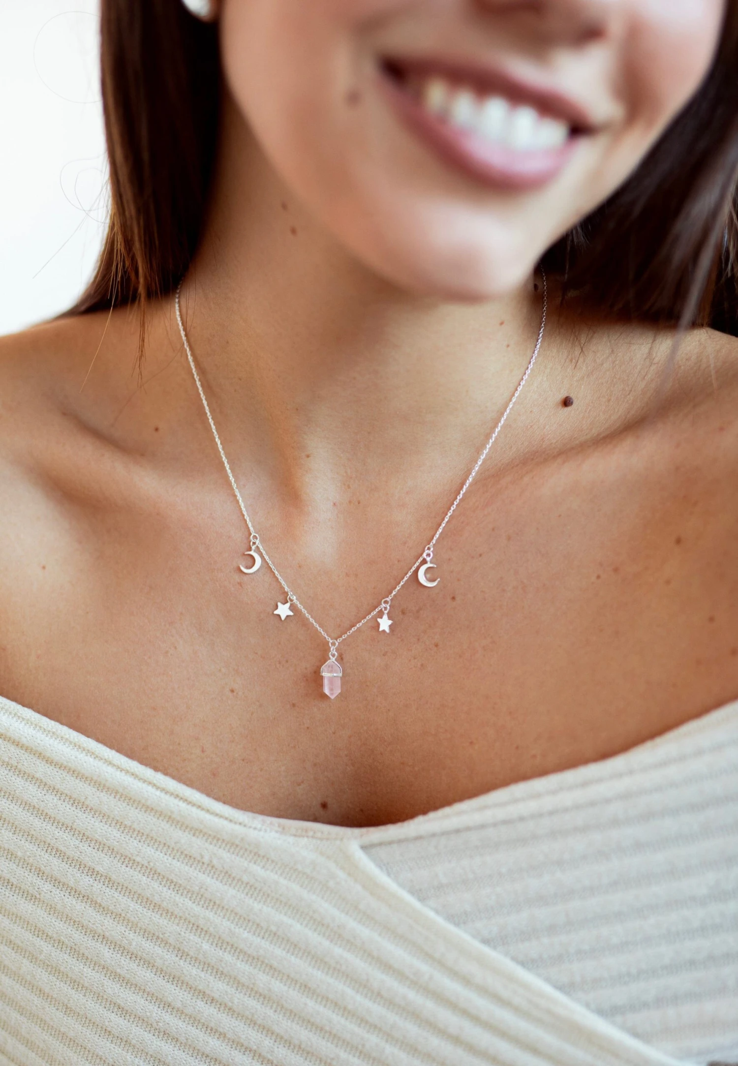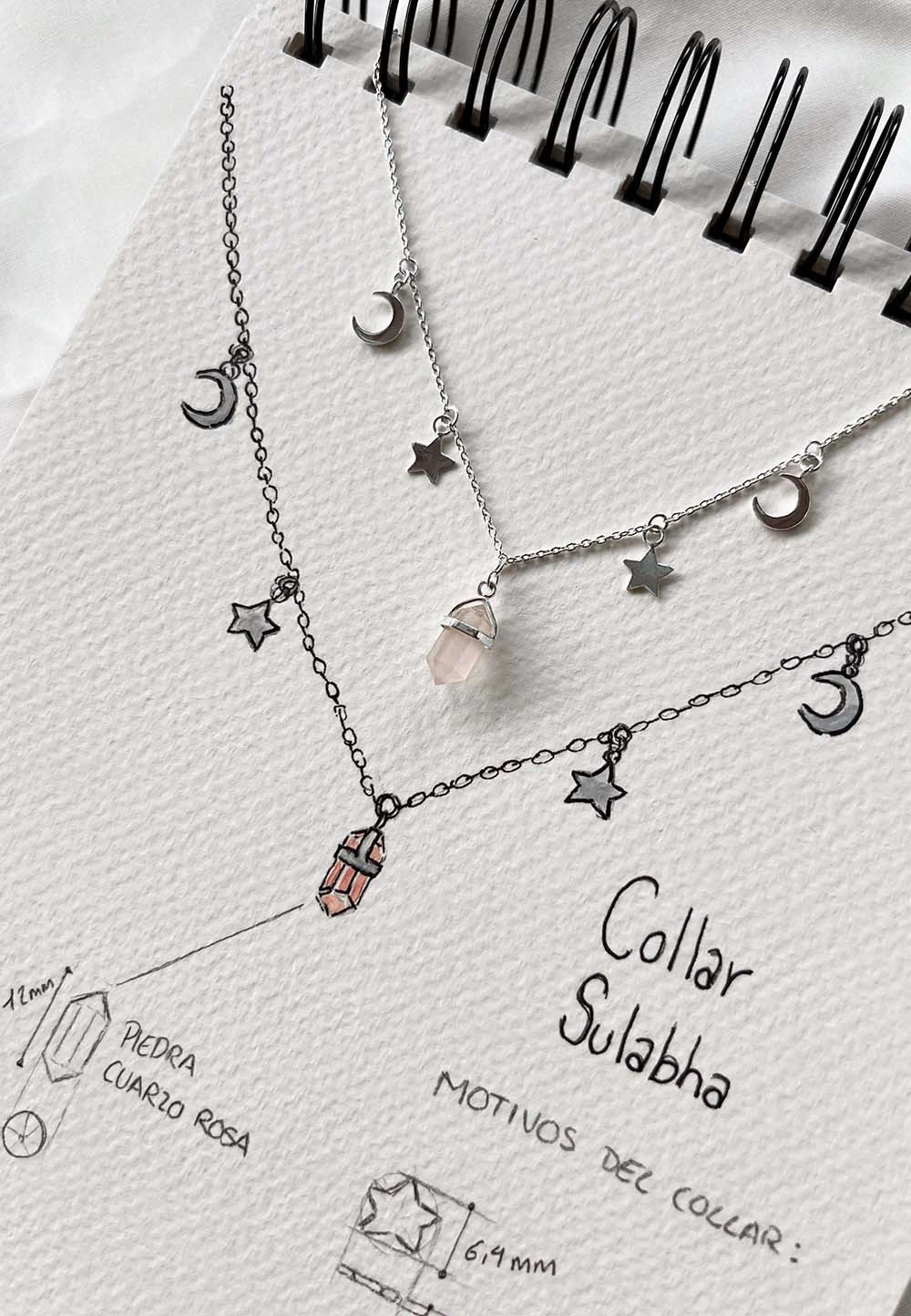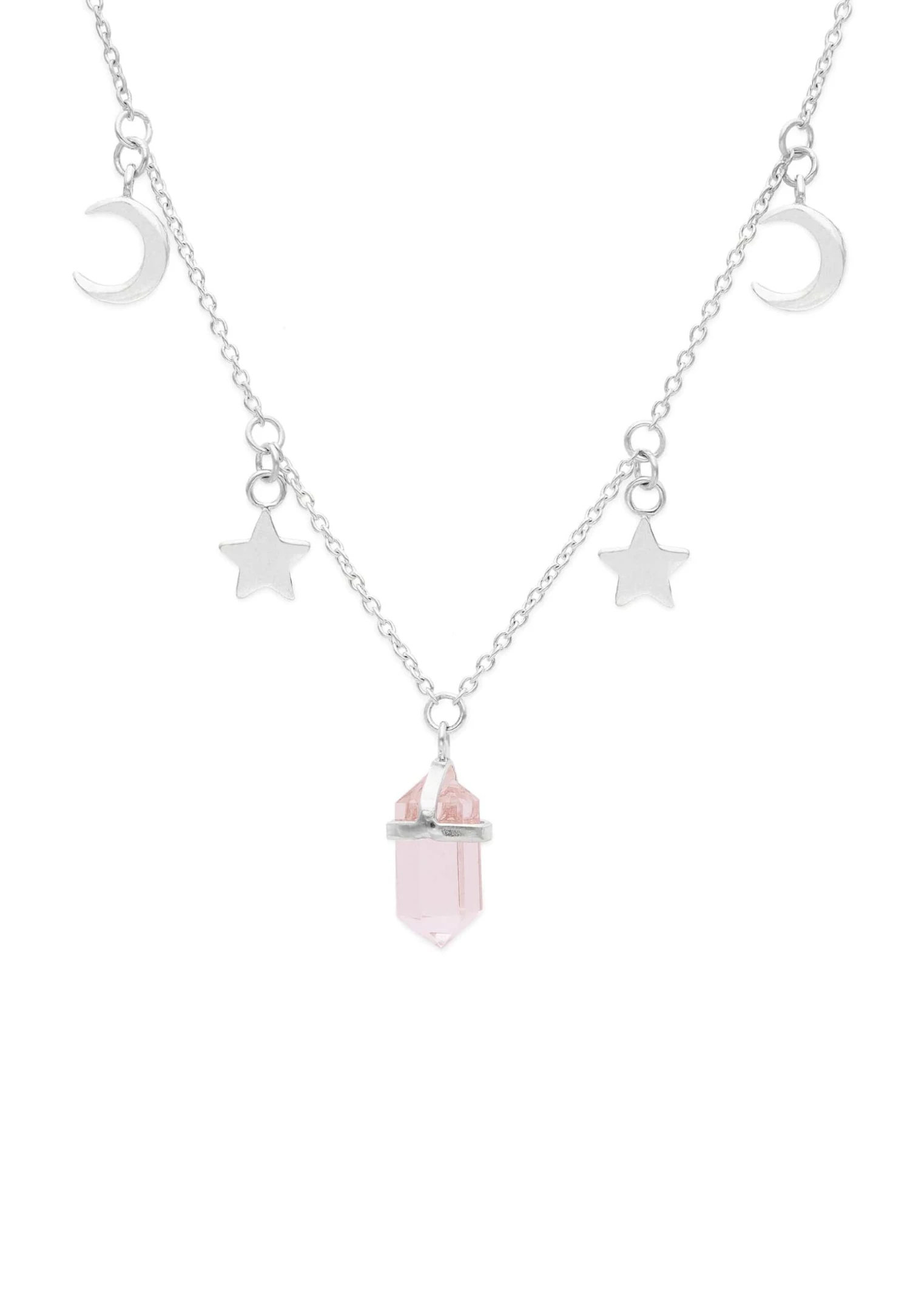 El collar Sulabha de plata de ley 925, ¡Te encantará! Esta formado por un conjunto de lunas y estrellas que el centro cuelga un obelisco que sostiene una hermosa piedra cuarzo rosa.