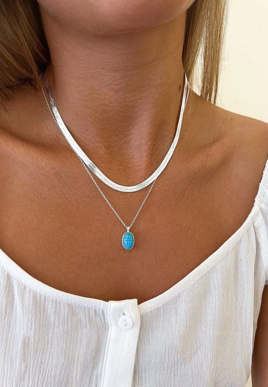 El TAABEEZ es un collar formado por una cadena de eslabones finita de Plata de Ley 925, con un colgante de un escarabajo egipcio azul.