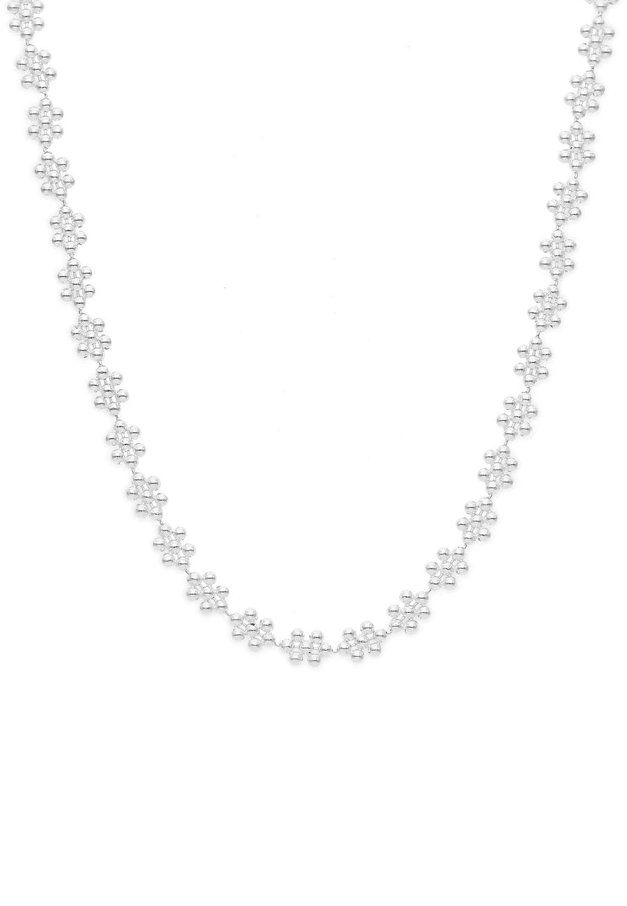 El diseño de este collar te va a encantar. Tiene muchas bolitas que se entrelazan entre sí, creando la figura encantadora de unas margaritas. Cada flor de estas está unida a la siguiente mediante las bolitas que hacen de pétalo.