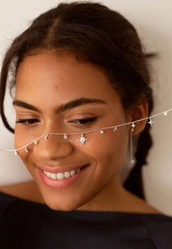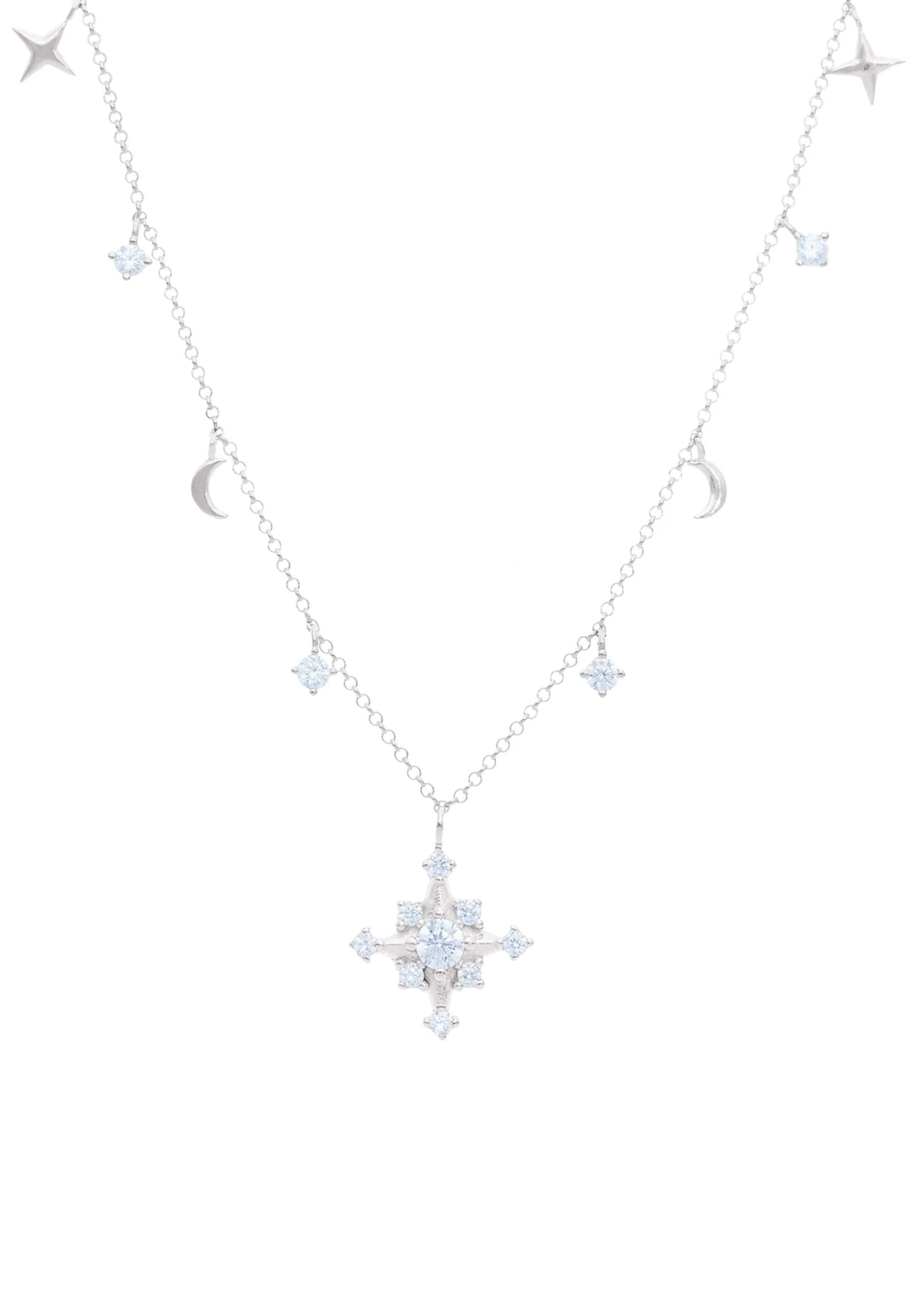 Este collar de plata de ley 925 es una pieza deslumbrante llena de detalles encantadores. En el centro, cuelga una pequeña estrella que está adornada con circonitas pequeñas, aportando un brillo sutil y elegante. A lo largo de la cadena, encuentras pequeños colgantes que incluyen lunas, estrellas y más circonitas, creando una combinación armoniosa y encantadora.