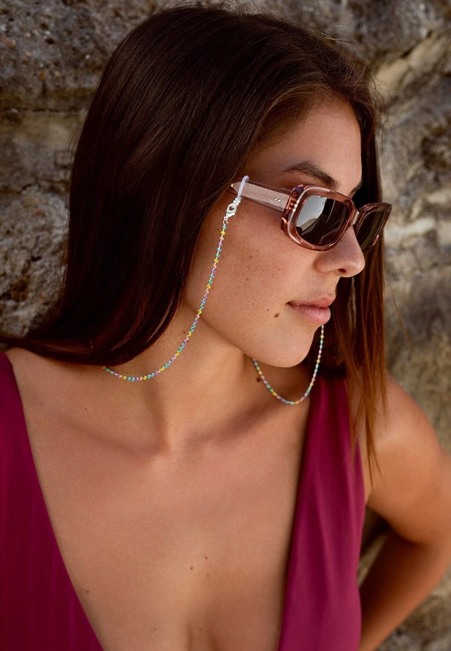 No solo es un accesorio estético, sino también una solución práctica y conveniente para mantener tus gafas cerca y seguras. Nunca más te preocuparás por perder tus gafas de sol en la playa o tener que guardarlas en el bolsillo. Simplemente engancha las patillas de tus gafas en los extremos de la cadena y deja que cuelguen con estilo.
