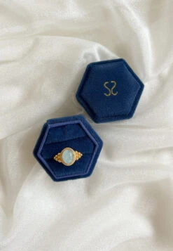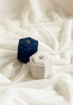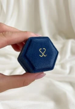 Este tesoro de terciopelo azul se presenta en una forma hexagonal única, añadiendo un toque de elegancia. Al abrirlo, te reciben dos compartimentos, para guardar dos anillos o incluso un conjunto de anillo con pendientes, la mejor forma de regalarle las joyitas a esa persona tan especial.
