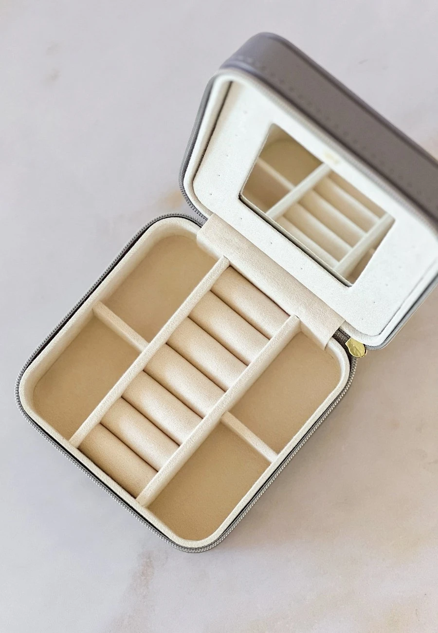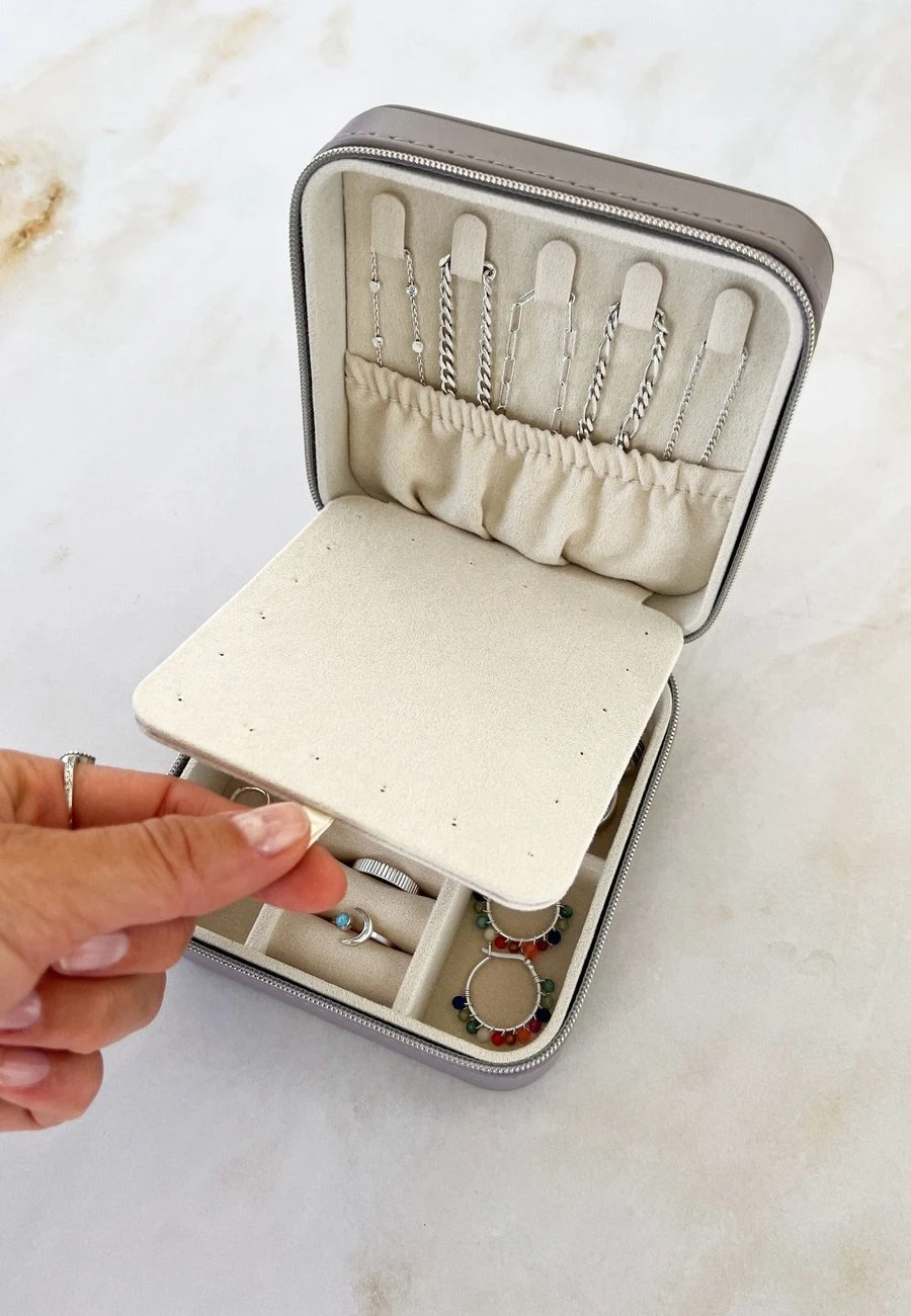 El joyero GAHANA GRIS es práctico, elegante y funcional, y te permitirá guardar, proteger y llevar tus joyas a cualquier lugar. ¡Perfecto para llevarlo contigo al gimnasio, de fin de semana, o durante todas tus vacaciones!