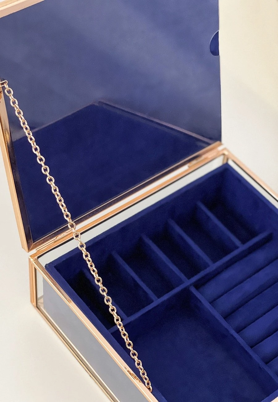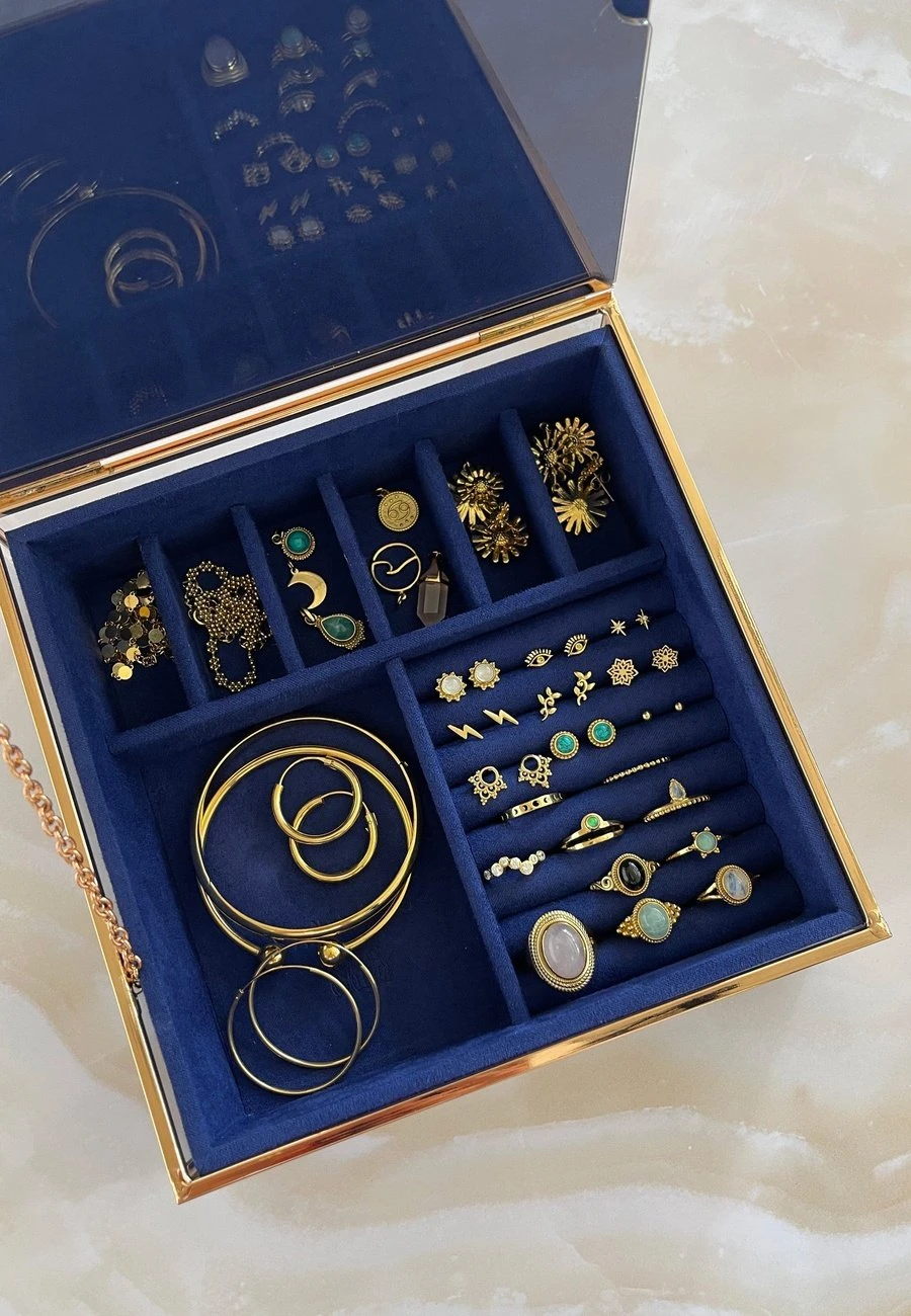 El interior del joyero es aterciopelado y está dividido en módulos de diferentes tamaños, ¡perfecto para guardar, ordenar y proteger todas tus joyitas!
