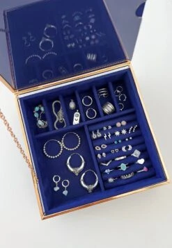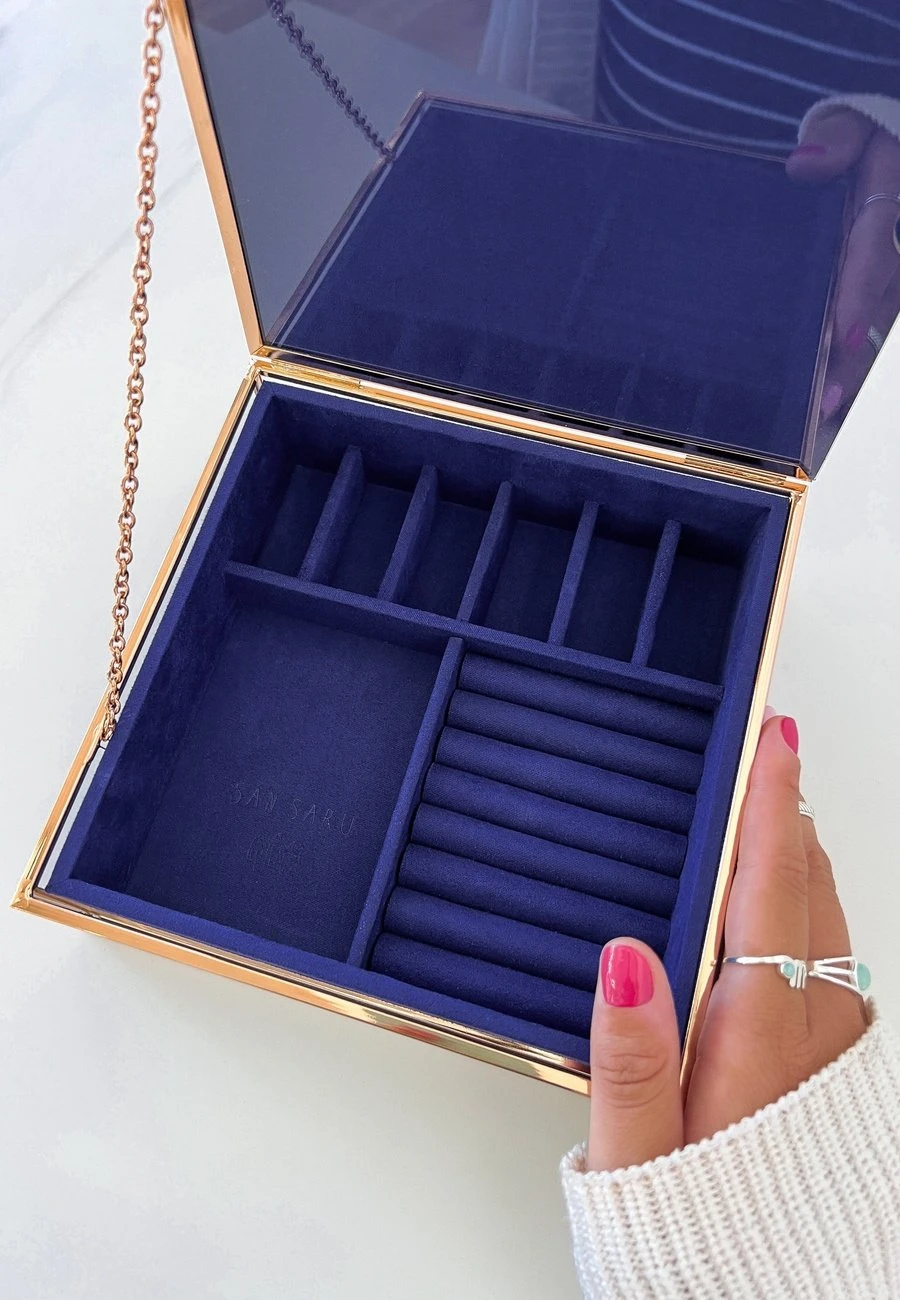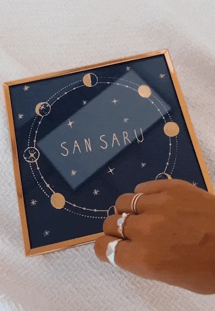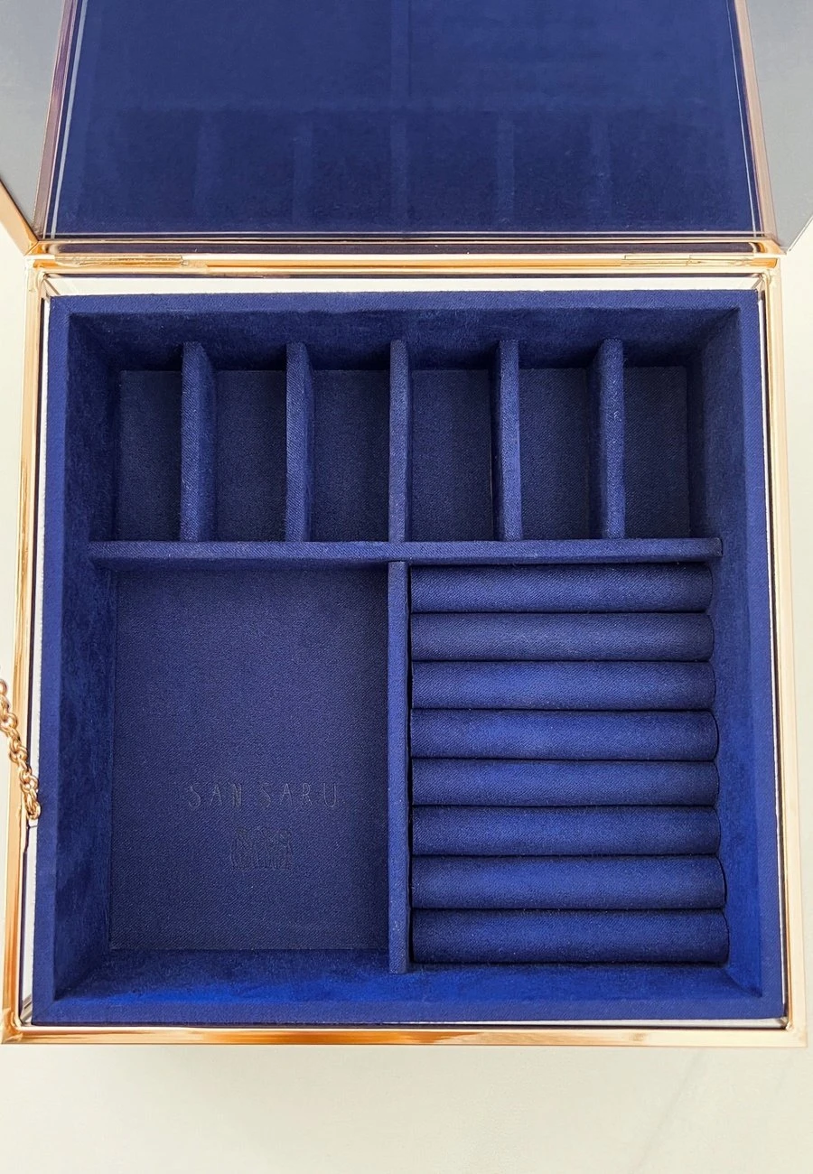 Tiene un diseño único con tonos dorados y azules que te encantará. Es el joyero ideal para las amantes de las constelaciones, ya que destaca por tener las fases lunares y estrellas rodeando el logo de San Saru