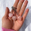 Este llavero está formado por un colgante de Cuarzo Rosa natural, así que cada pieza puede tener una tonalidad y forma distinta. ¡Es un llavero de forma asimétrica único!