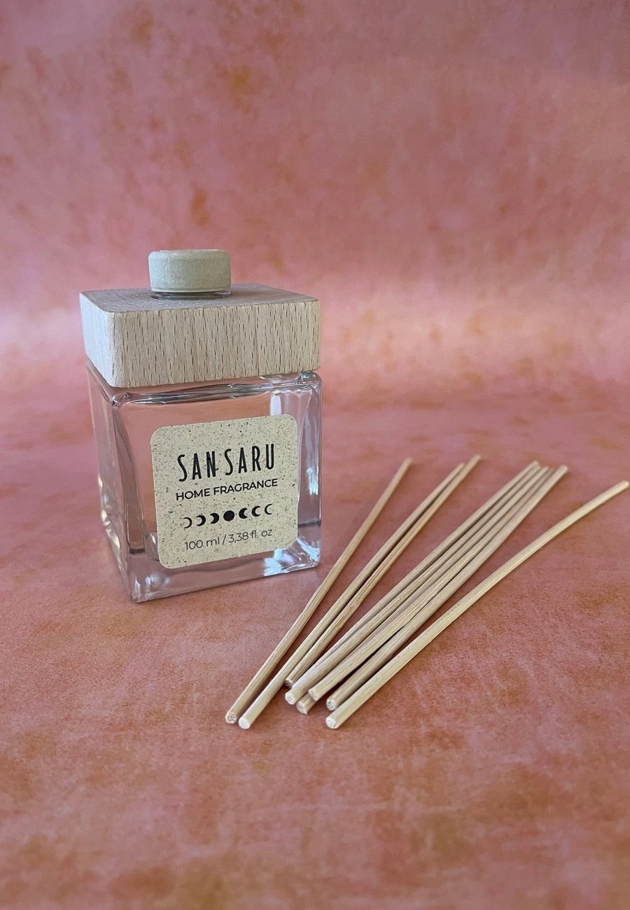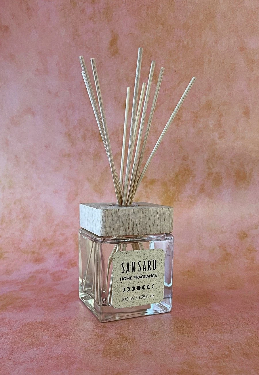 Cada gota de nuestro perfume de mikado es un abrazo olfativo que transformará tus espacios en un rincón de dulzura y bienestar. Deja que el encanto de SAN SARU se infunda en cada rincón, creando una atmósfera envolvente que te hará sentir como en casa.