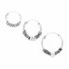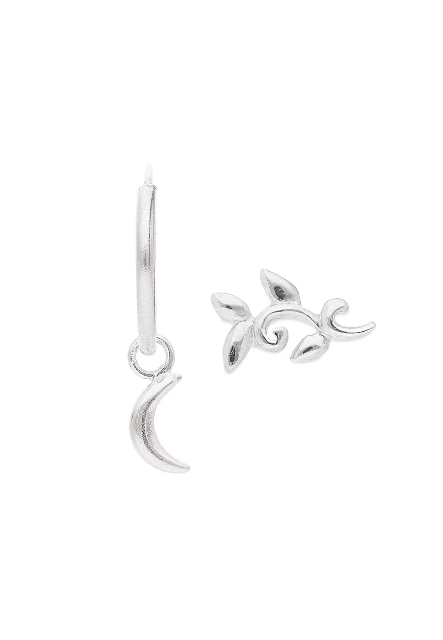 El pack de pendientes ARVIND que está elaborado con plata de Ley 925. El pendiente BHANU es un arito fino con una pequeña luna colgando y el pendiente CHAD es una pequeña rama curvada con hojas. ¡Te van a encantar!