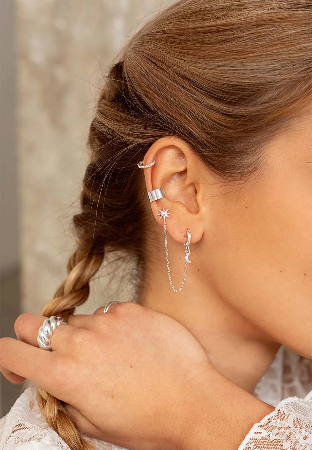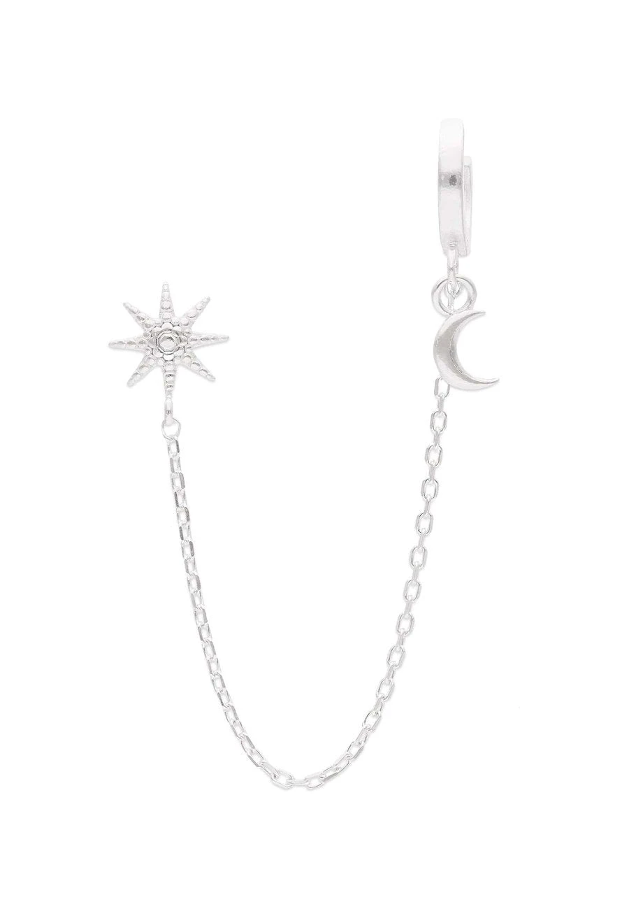 El KAUR es un pendiente de cadena con una estrella en una extremo y un aro en la otra. Al lado del aro, cuelga una pequeña lunita. Está elaborado en Plata de Ley 925. ¡Te encantará!