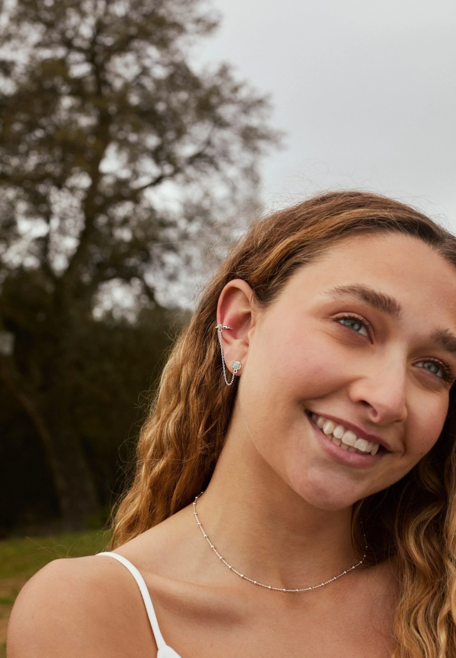 Este pendiente Natesa de plata de ley 925 cuenta con una vibrante piedra de amazonita, que añade un toque de color y elegancia. Está diseñado con un estilo único: una cadena fina que une la piedra principal con un segundo pendiente más pequeño.