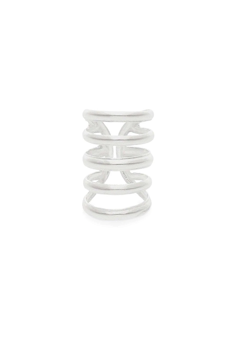 El pendiente THRE consta de cinco tiras finitas de plata que se ajustan perfectamente a la oreja. El pendiente THRE es un earcuff, no lleva ni requiere de agujero.