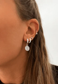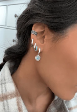 Los pendientes AANKHN son unos pendientes con forma de ojo. Su diseño consiste de un aro pequeño y grueso del que cuelga un colgante redondo de plata. En su interior hay un ojo con una piedra natural.