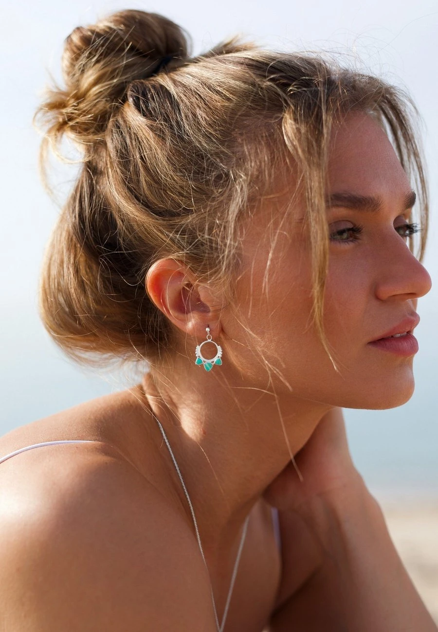 Los BALDEV son unos pendientes de bolita de los que cuelgan unos aros de 15 mm con tres piedras turquesas. Las piedras tienen forma de triángulo y contienen vetas distintas, eso hace que cada aro sea único.